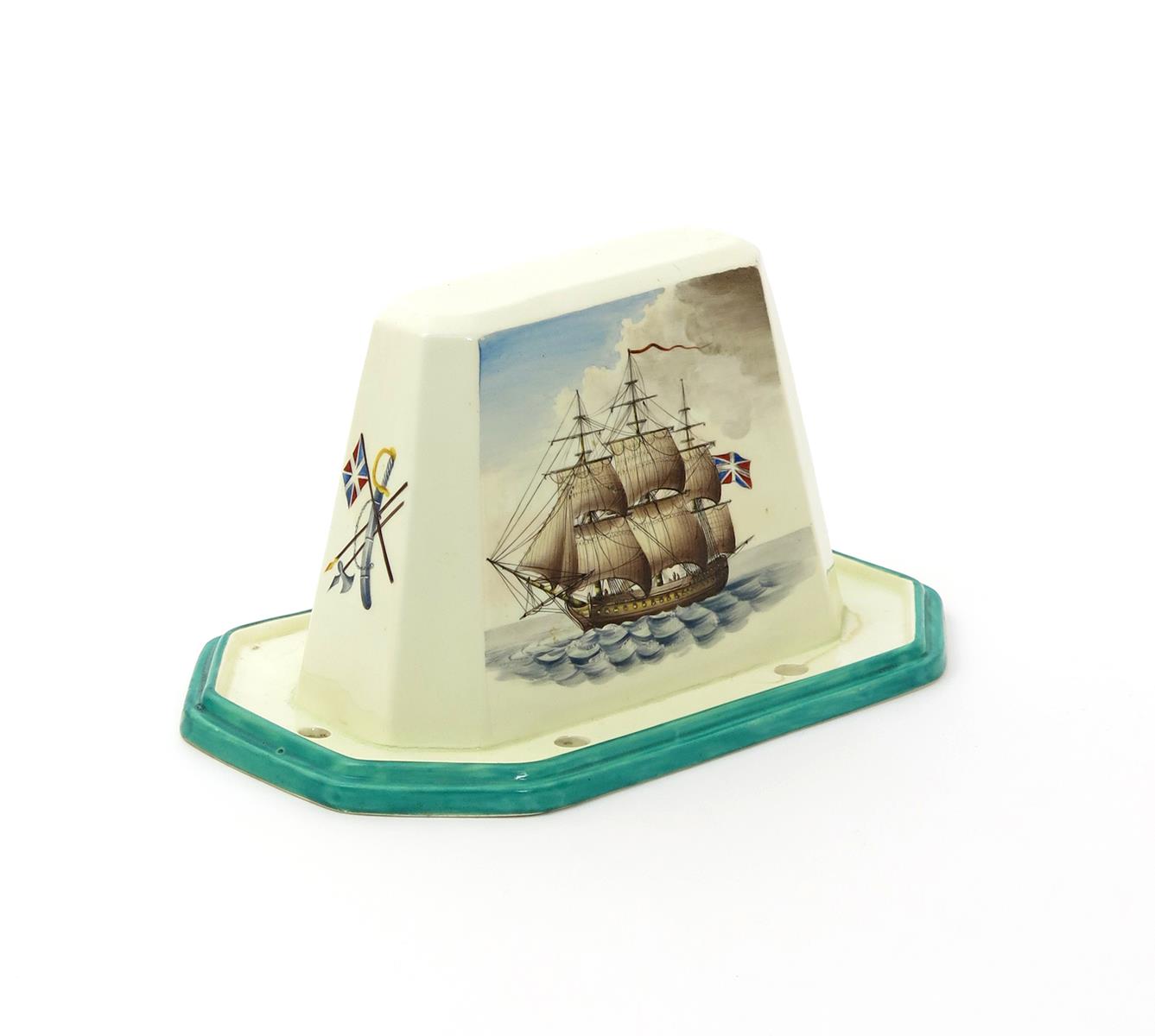 A creamware jelly mould core late 18th/early 19th century, possibly Wilson, of canted rectangular form, painted to one side with a three-masted ship at sail in a choppy sea, the sides and reverse with military trophies and motifs, the base pierced with six holes and edged in green, a crack around the base, 26cm across.