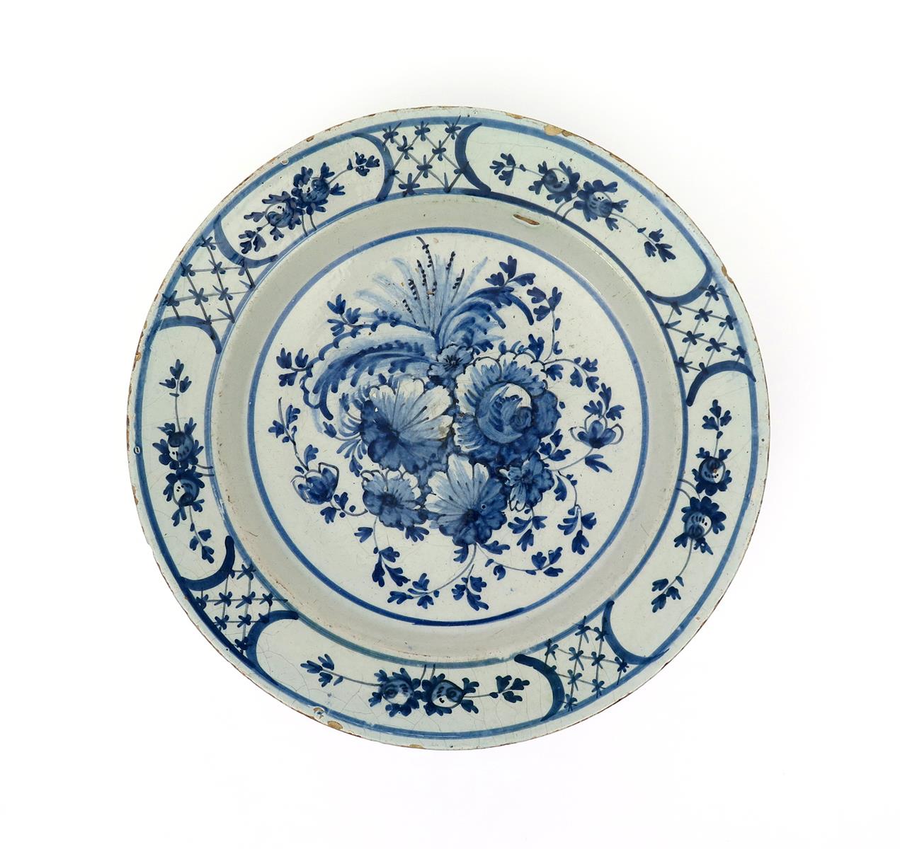 A large London delftware charger c.1770-80, painted in blue with an arrangement of roses and other flowers, the rim with five panels of further flowers reserved on a hatched diaper ground, some glaze chipping, 35.5cm.