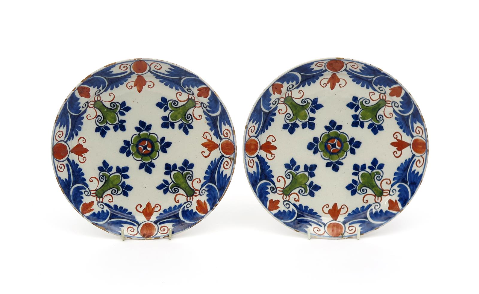 A pair of London delftware plates c.1720, painted in blue, red and green with a formal design of fleur de lys motifs around a central flowerhead, the rim with foliate sprays, 22.3cm. (2)