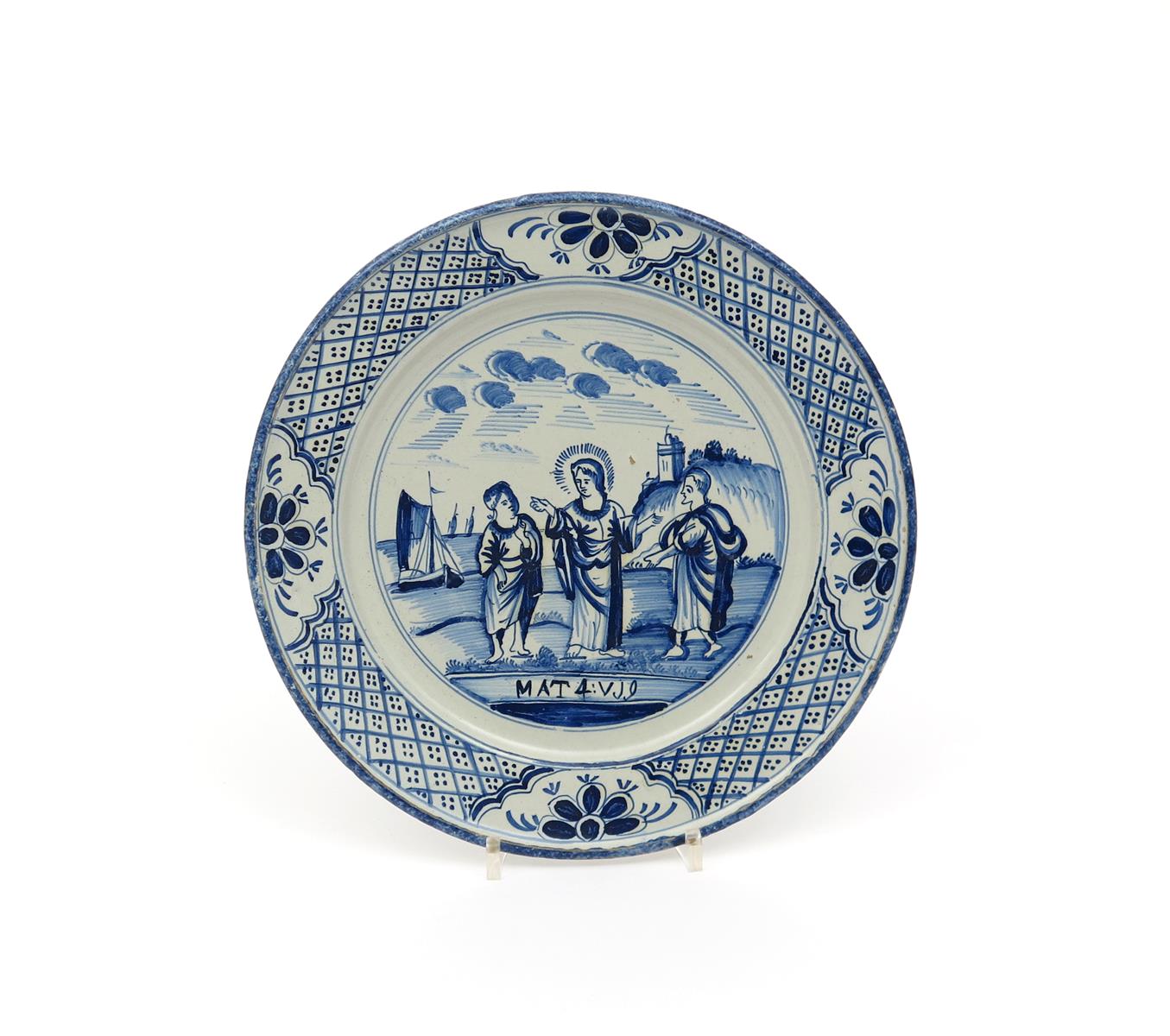 A Delft Biblical plate dated 1788, the well painted with a scene of Jesus with Simon (Peter) and his brother Andrew from Matthew 4:19, the rim with four panels of flowers reserved on a hatched diaper ground, incised 'AA 1788' to the base, 23.3cm.