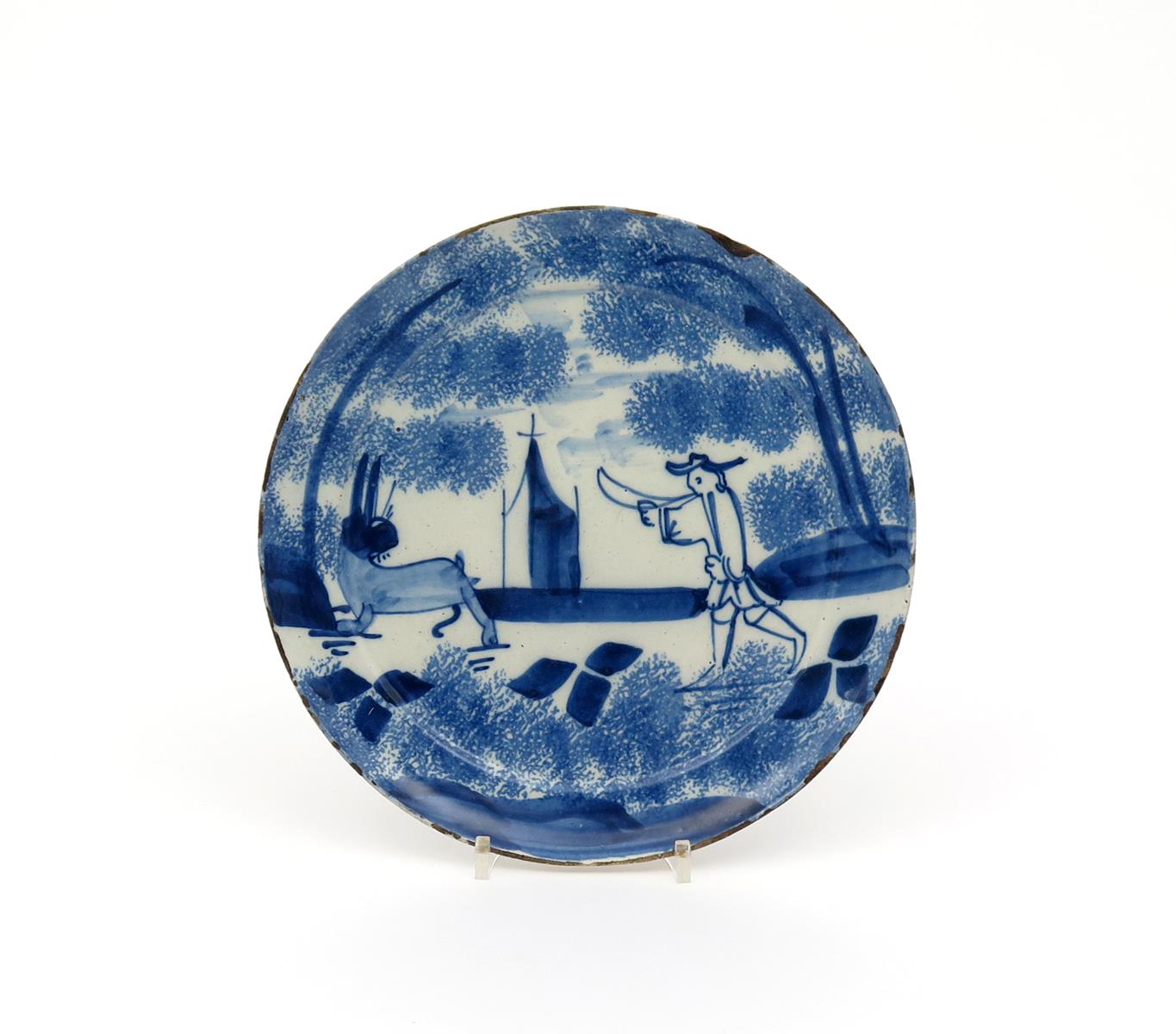 A Delft plate early 18th century, painted with a large hare or rabbit being pursued by a figure beneath tall sponged trees, a simple church building in the background, 23.2cm.