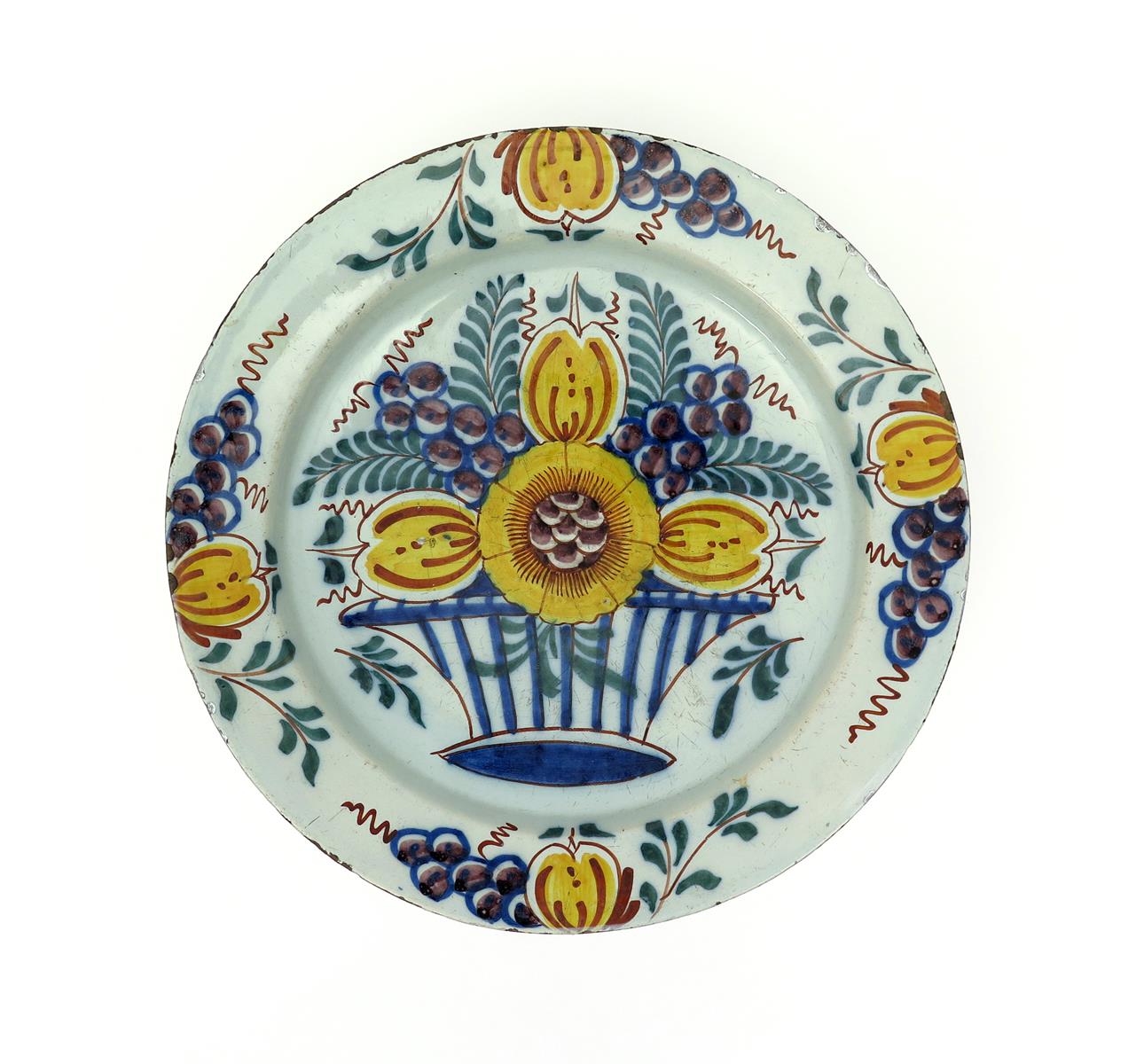 A large Delft dish or charger c.1740-60, painted in bold polychrome enamels with a basket of fruit and flowers, the rim with four similar sprays, some glaze chipping, 34.7cm.