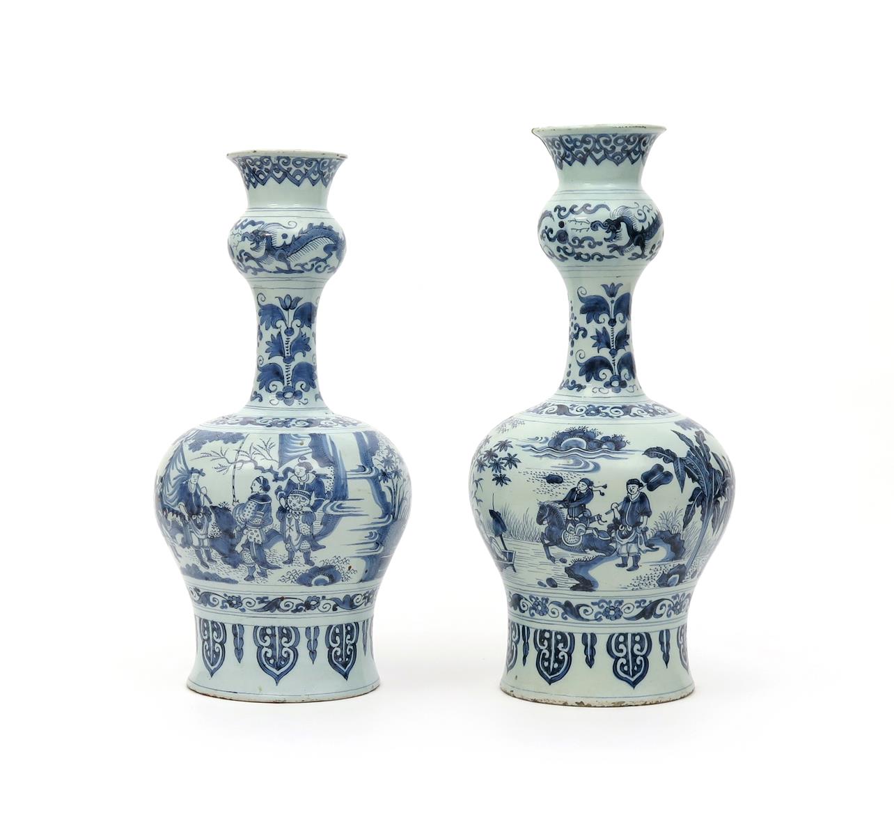 A near pair of large Dutch Delft vases late 17th/early 18th century, the baluster bodies rising to slender necks with an onion knop, painted with scenes of Chinese figures at various pursuits in landscapes above a stiff leaf border, the knopped necks with dragons chasing flaming pearls, marked 7 to the undersides, the larger with restuck sections to the rim, 44.5cm max. (2)