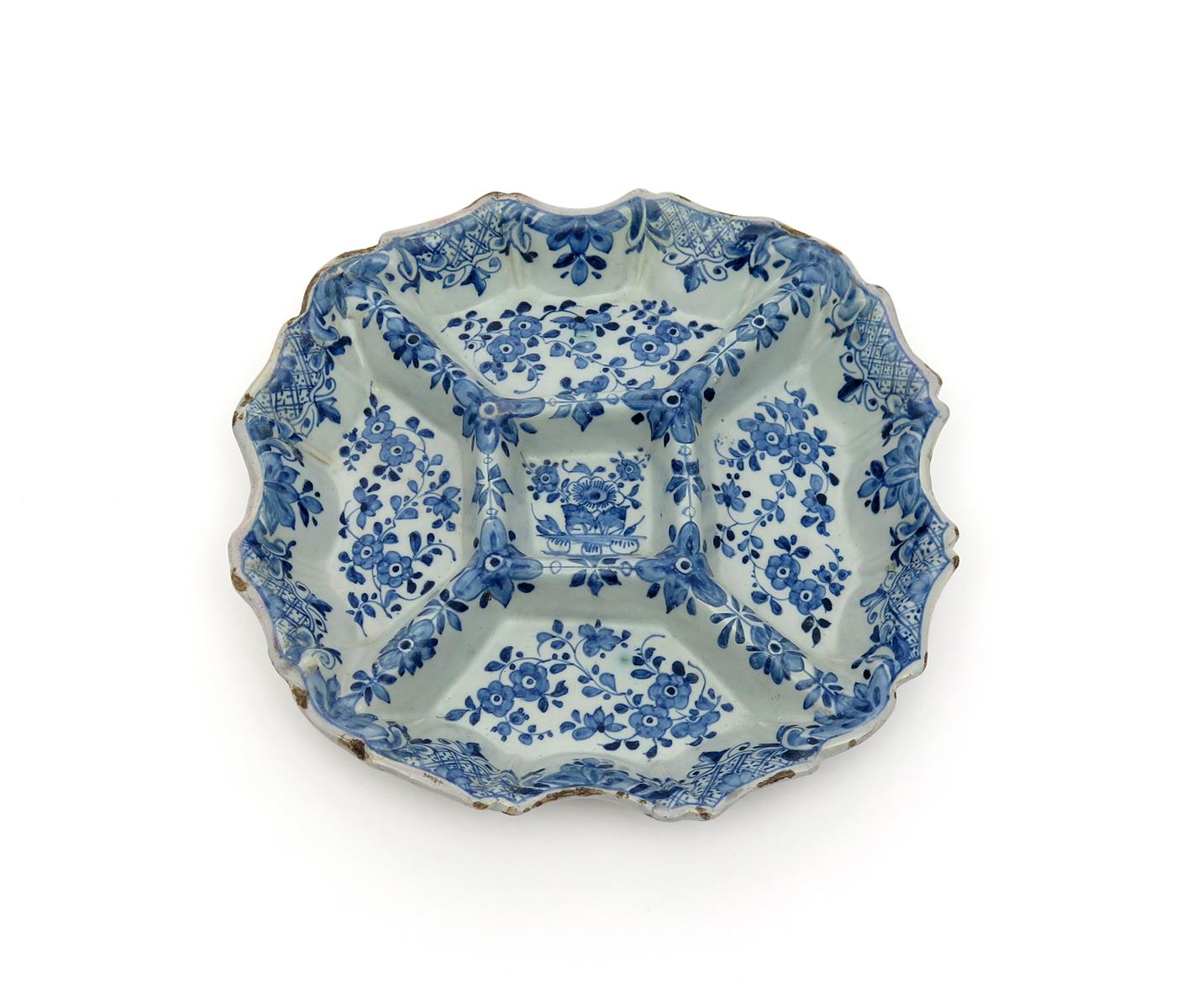 A delftware sweetmeat dish c.1740-60, probably Liverpool, moulded with four shaped compartments around a central small square well, painted in blue with flower sprays within a border of diaper panels and foliate scrolls, good restoration, 24.7cm.
