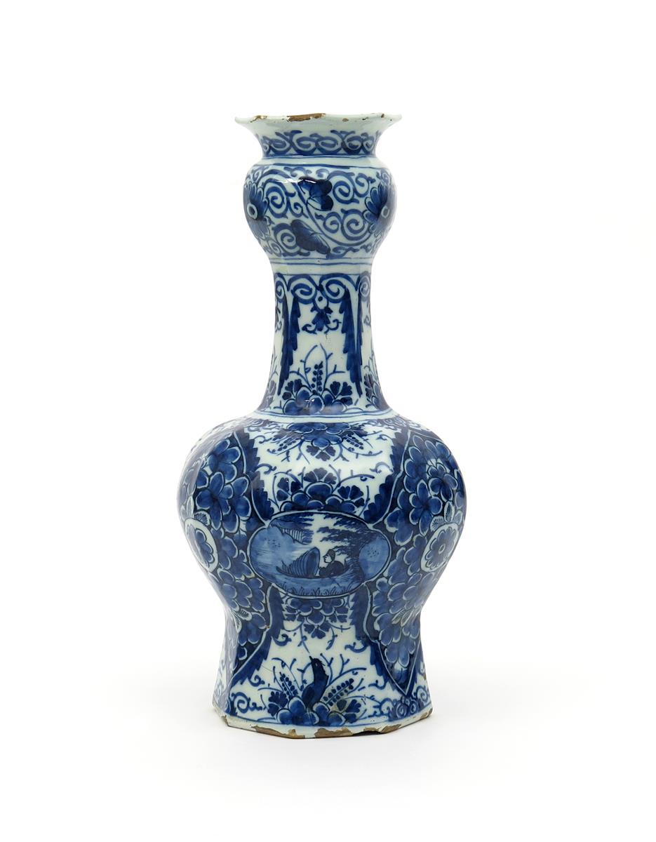 A tall Delft vase early 18th century, of octagonal baluster form, painted with three small panels of a figure in a sampan, overlapping larger panels of flowers, the tall neck rising to a swollen knop, a 3cm chip to the rim, 35.5cm.
