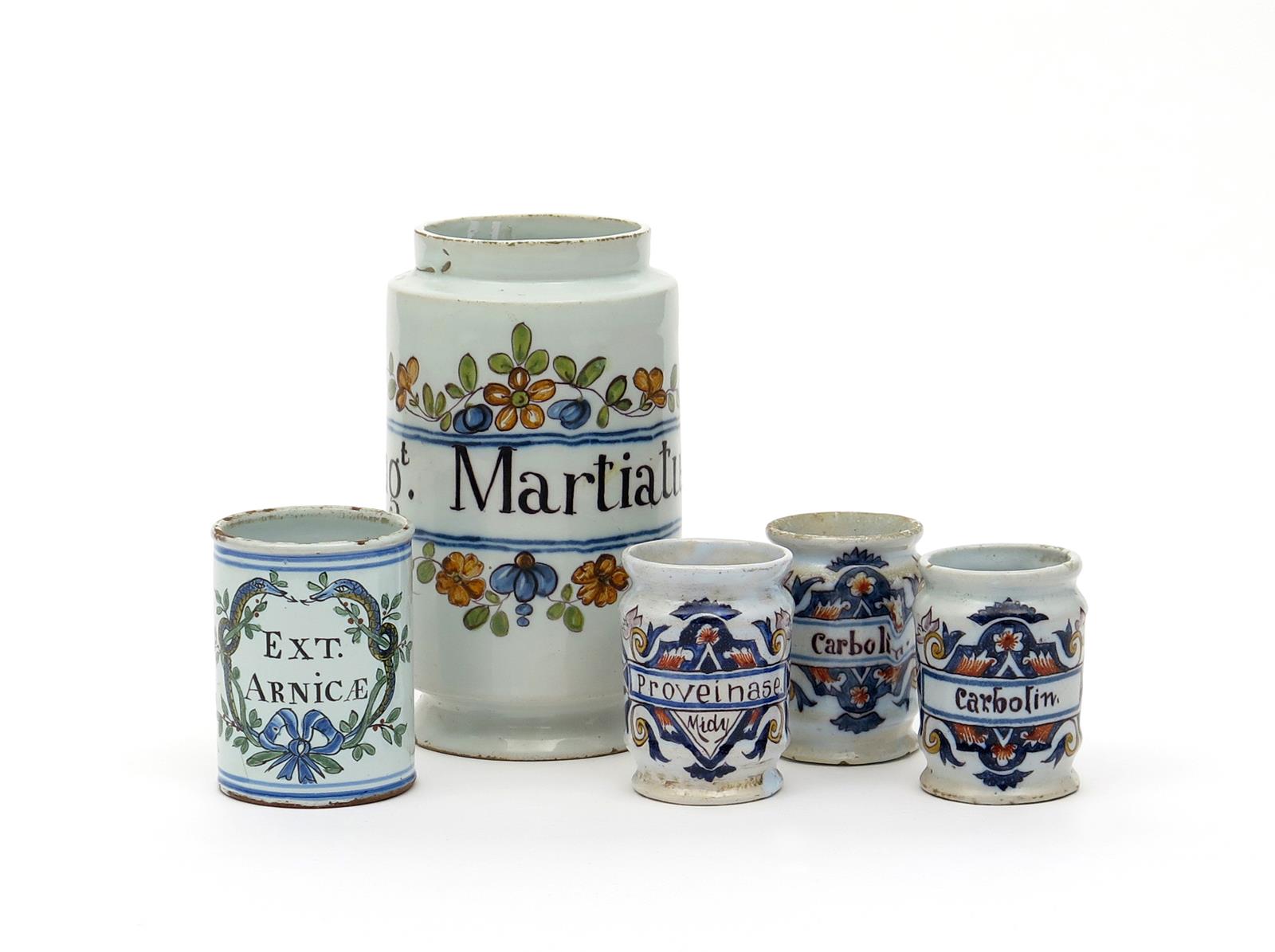 Five Continental faïence apothecary jars 18th/19th century, the largest of cylindrical form and inscribed 'Martiatum' within a floral cartouche, one inscribed 'Ext. Arnicae' between snakes, the others a set of three ointment pots, 18.7cm max. (5)