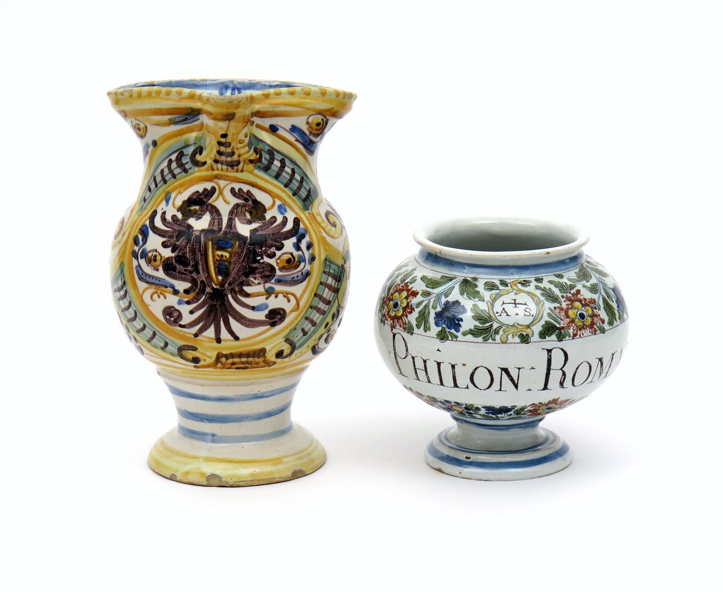 A Continental faïence drug jar late 18th/19th century, the globular body titled 'Philon:Roman' between bands of polychrome flowers, a small panel containing the initials 'AS', and a maiolica jug, probably 19th century Pesaro, painted with a double-headed eagle with a stylized shield to its chest, reserved in a panel within leaf scrolls, 23cm max. (2)