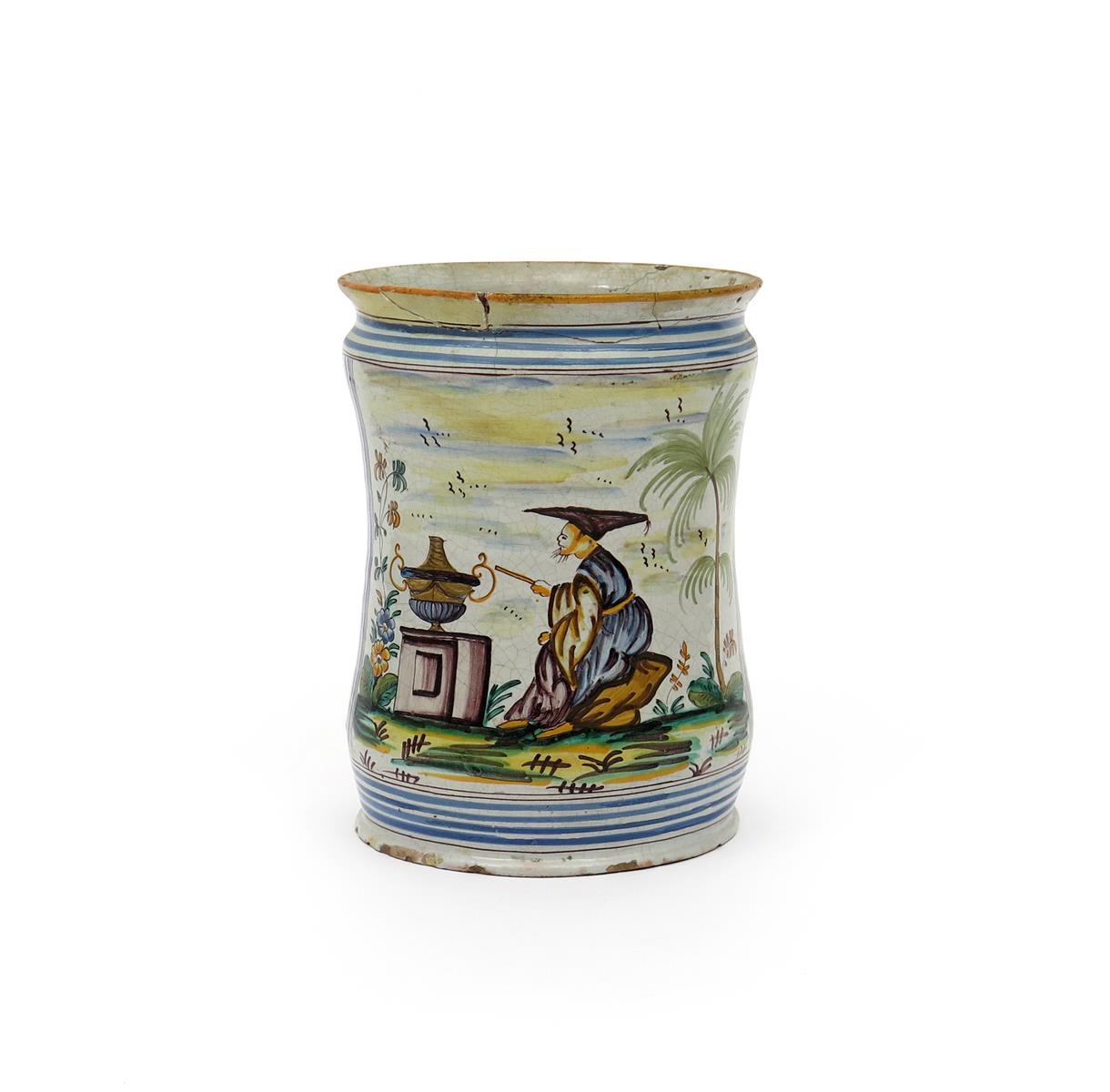 A large Naples maiolica albarello early 18th century, the slightly waisted form painted in polychrome enamels with a Chinese figure seated beside a large urn beneath a fringed tree, the foot and neck edged in horizontal blue bands, small sections of the rim broken out and restuck, 25cm.