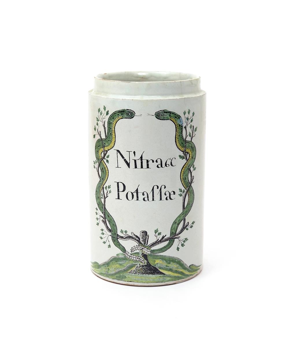 A French faïence albarello late 18th century, Paris or Rouen, the large cylindrical form painted in green, yellow and black with two snakes entwining around narrow branches, flanking the inscription 'Nitraec Potassae', restored, 26.7cm.
