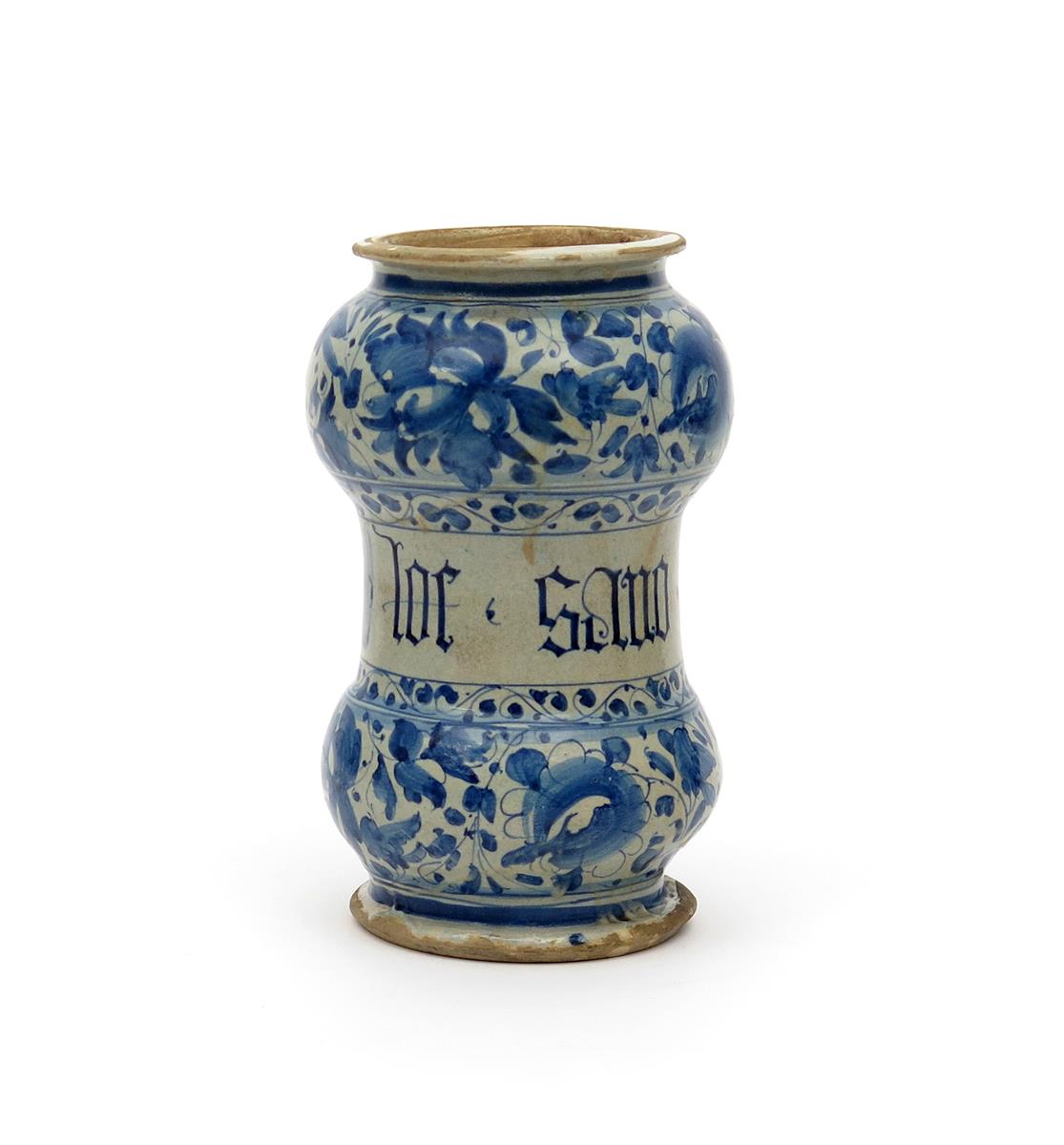 An Italian maiolica albarello mid 16th century Venice, of dumbbell form, with an inscription between continuous bands of foliate scrolls, 21cm.