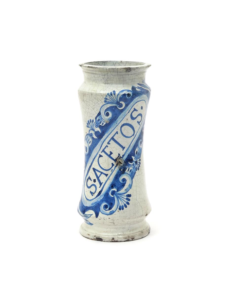 A Portuguese faïence albarello late 17th century, of tall waisted form, painted in blue with a diagonal cartouche inscribed 'S. ACETOS', within a simple scroll design, some damages, 24cm.