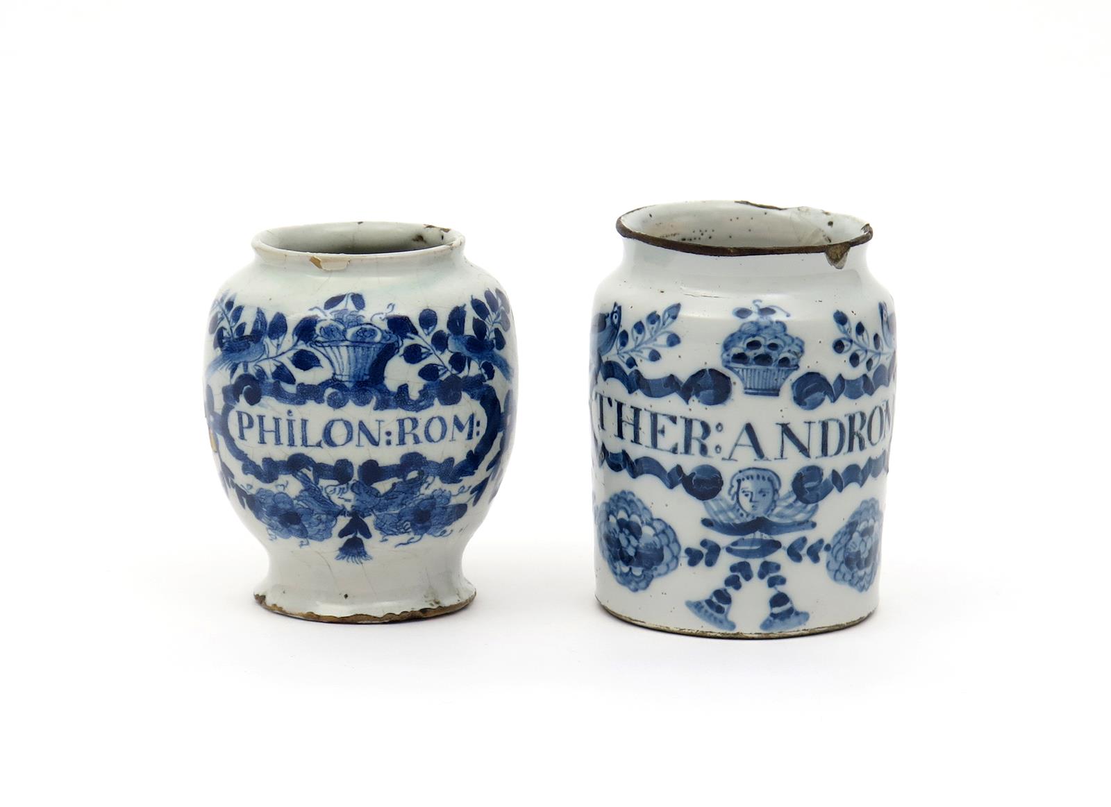Two small delftware dry drug or pill jars 1st half 18th century, both painted in blue with birds among branches flanking a basket of fruit, one cylindrical and inscribed 'THER:ANDROM', the other ovoid and inscribed 'PHILON:ROM', small faults, 9.8cm max. (2)