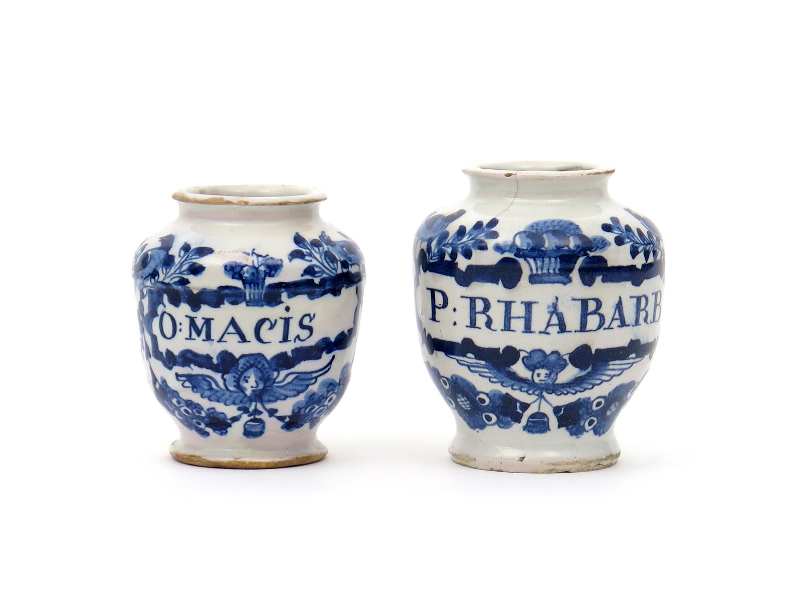 Two small delftware dry drug or pill jars 1st half 18th century, both painted in blue with birds in leafy branches flanking baskets of fruit above banners inscribed 'O:MACIS' and P:RHABARB', the larger with a painted number to the underside, a rim crack, 9.6cm max. (2)
