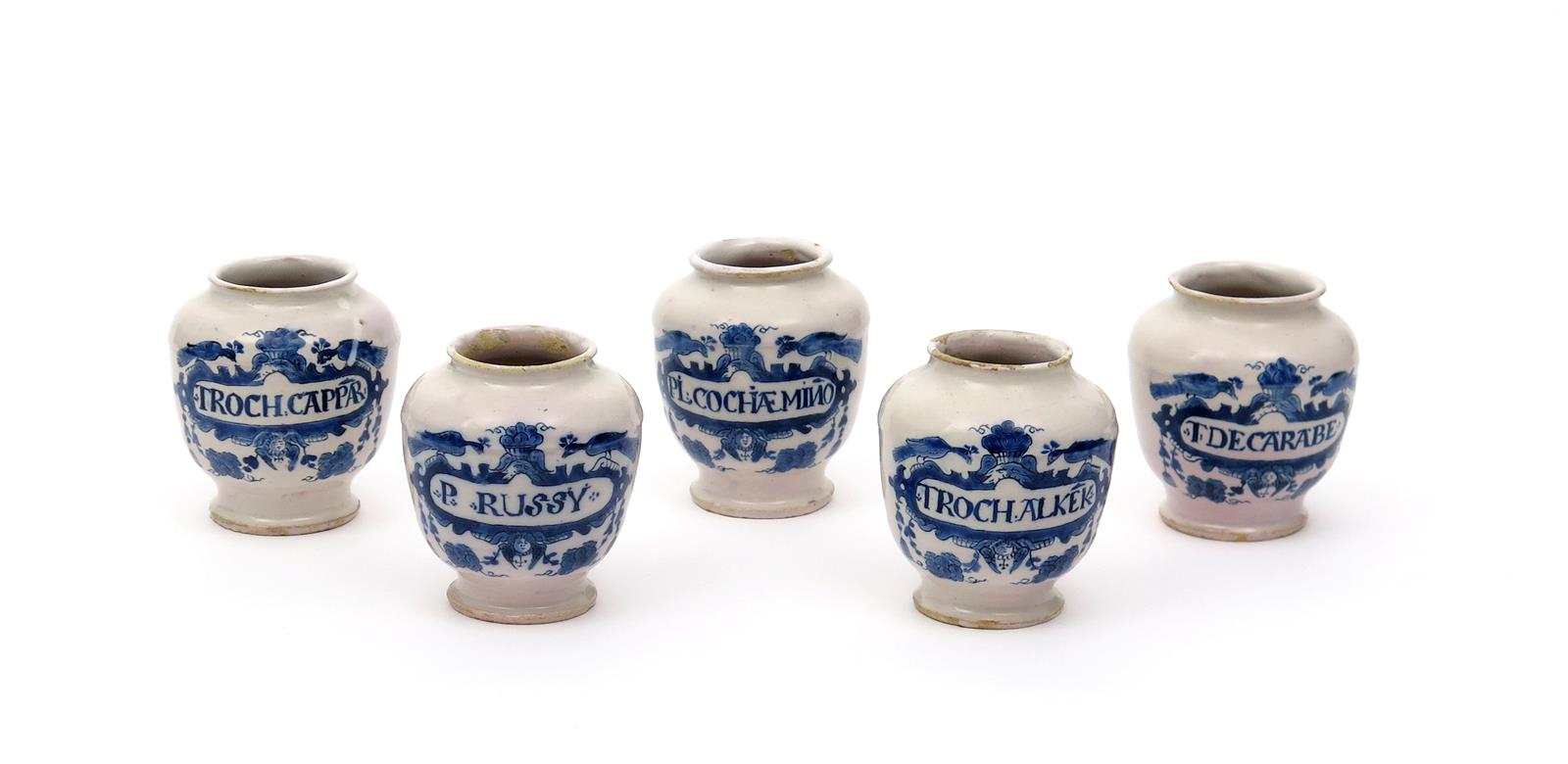A rare set of five London delftware dry drug or pill jars c.1720, painted in blue with peacocks flanking baskets of fruit above inscribed banners, titled 'PL:COCHIÆ MINO', 'TROCH.CAPPAR', 'P:RUSSY', 'T:DECARRABE' and 'TROCH.ALKEK', some glaze chipping, 9.6cm. (5)