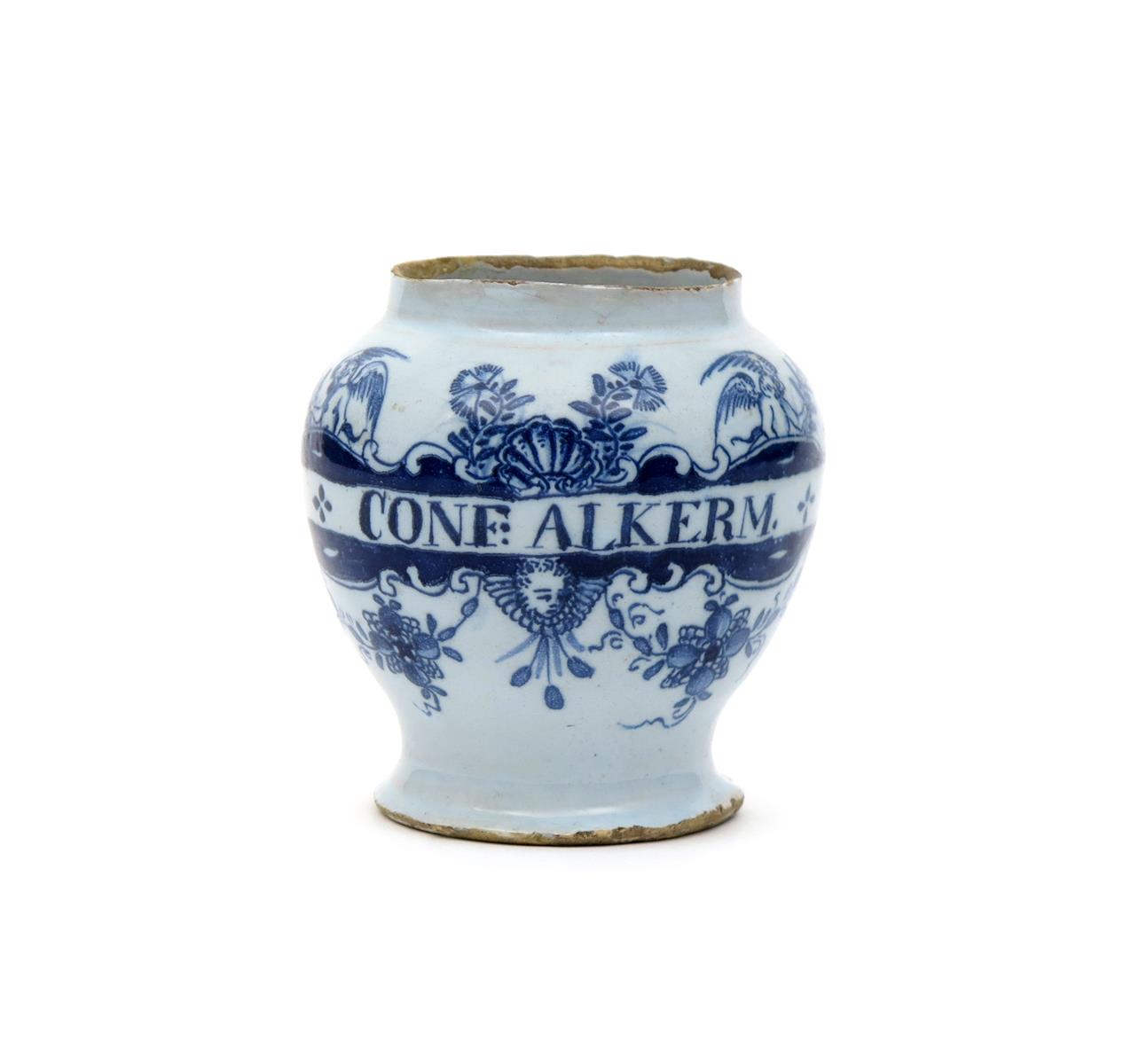 A small London dry drug or pill jar 1st half 18th century, painted in blue with winged putti flanking flower sprays and a scallop shell above a banner inscribed 'CONF:ALKERM', a rim crack, 10cm high.