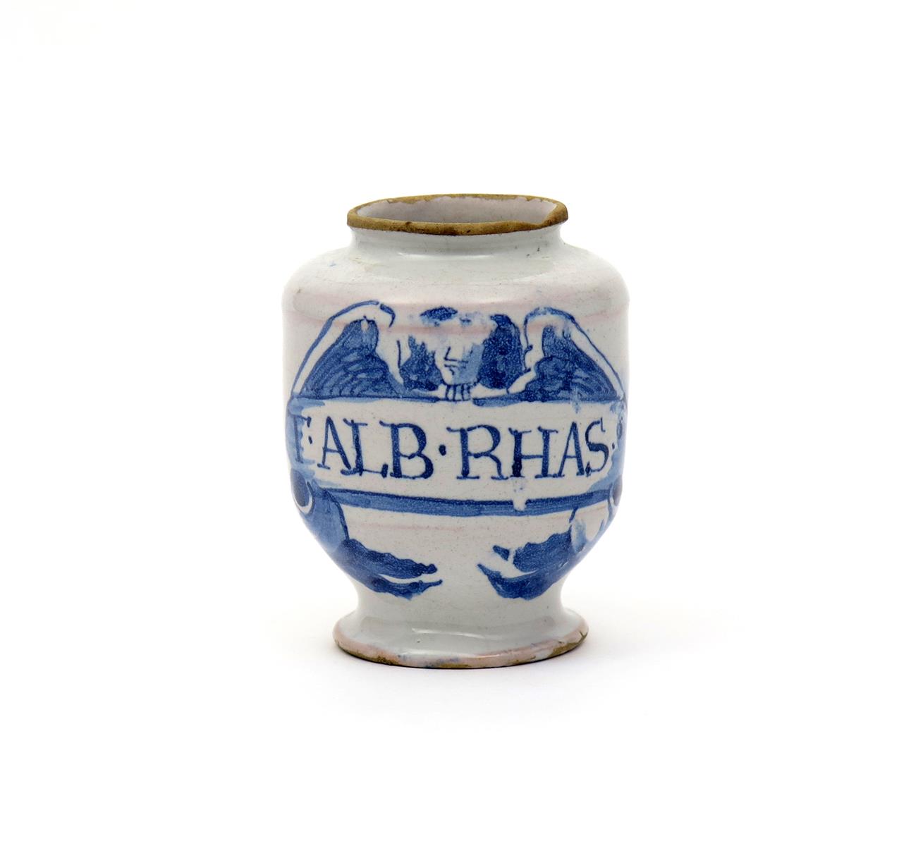 An early small delftware dry drug or pill jar c.1680, painted in blue with an angel with outstretched wings above a banner inscribed 'T.ALB.RHAS', a chip to the inside rim, 10cm high.