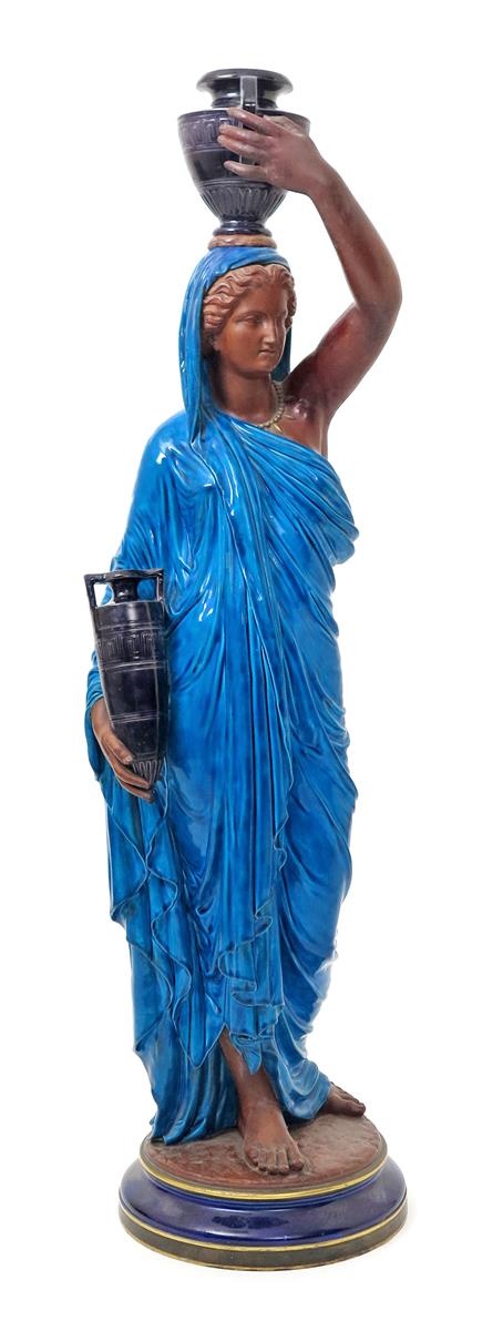 A massive Royal Worcester figure of a Grecian water carrier date code for 1880, modelled by James Hadley, a two-handled urn resting on the top of her head, a further slender vase in her right hand, dressed in a flowing turquoise robe and raised on a circular base, impressed factory mark and R date code, some restoration, 86.5cm.