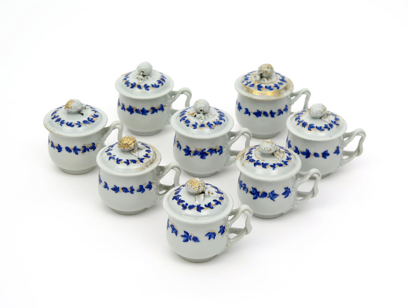 Eight Chinese porcelain custard cups and covers late 18th century, painted in overglaze blue and gilt with continuous bands of fruiting grapevine, the covers surmounted with fruit finials, some gilt wear, 8.5cm. (16)