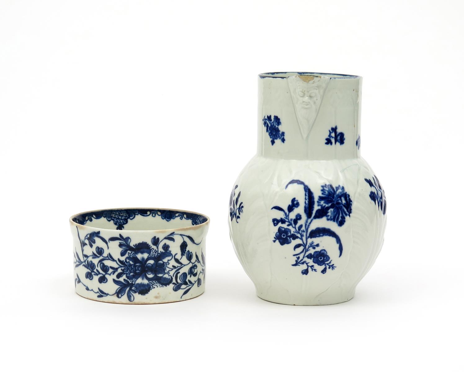 A Worcester blue and white potted meat tub c.1760, painted with the Mansfield pattern, the border to the interior rim, and a Worcester cabbage leaf jug printed with the Gillyflower pattern, crescent marks, small faults, 18.3cm max. (2)