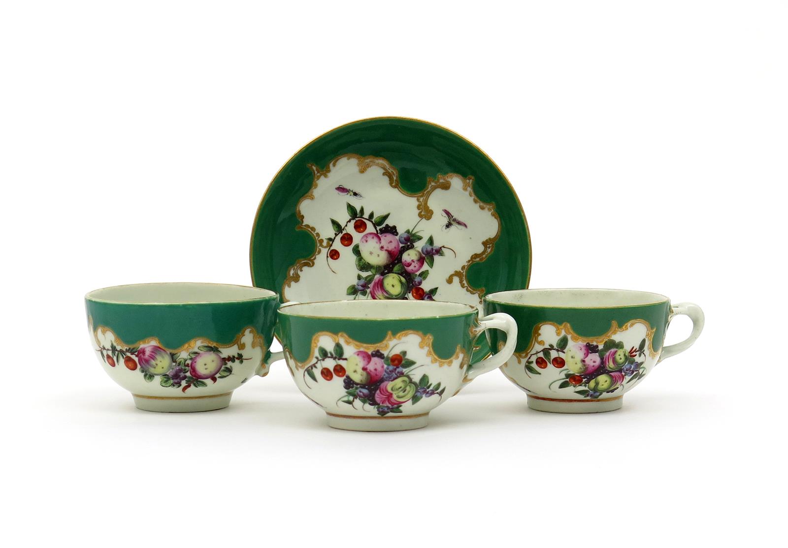 Three Worcester tea cups and a saucer c.1770, painted with sprays of spotted fruit amidst scattered insects, reserved within shaped apple green borders, blue crossed swords and 9 marks, 13cm. (4)