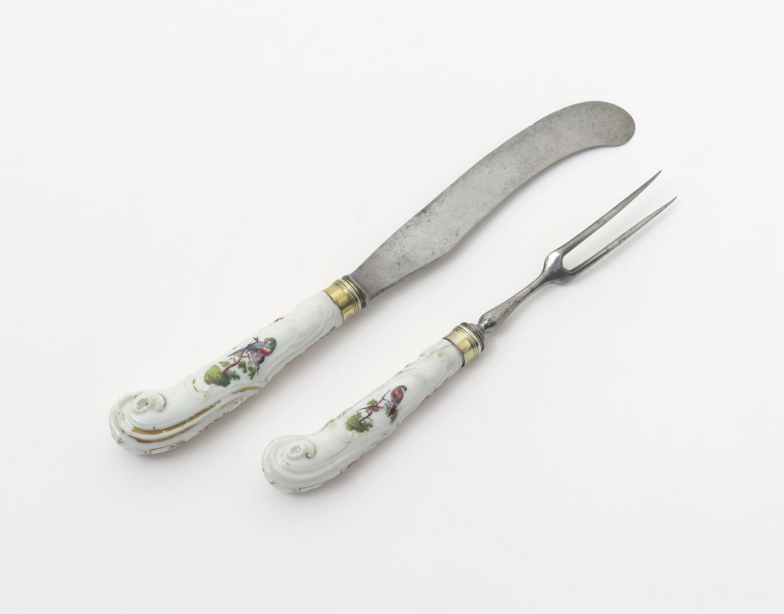 A knife and fork with Chelsea porcelain handles c.1760, with scroll moulded pistol hafts, painted with panels of exotic birds and sprays of European flowers within gilt detailing, 28.5cm overall. (2)