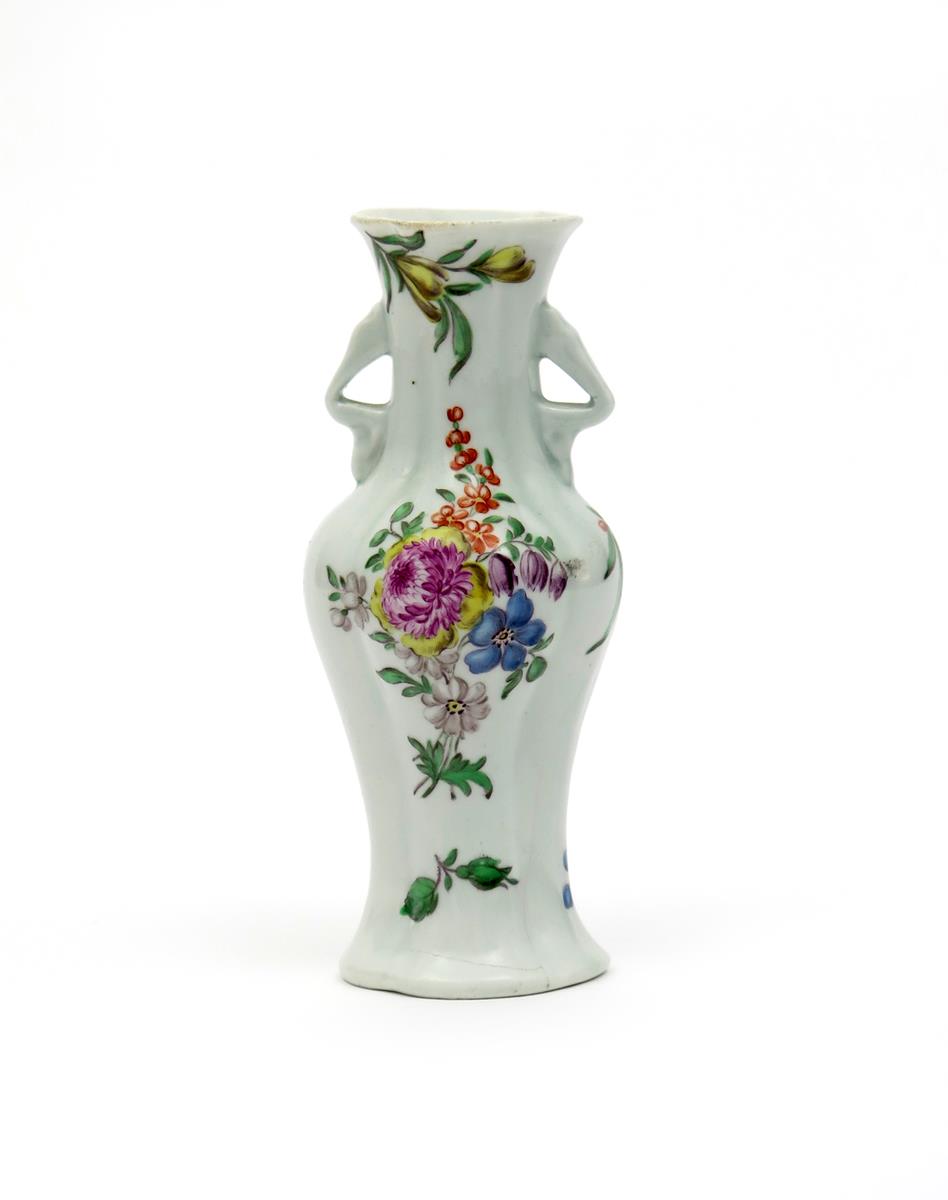 An early Worcester quatrefoil vase c.1753-55, the lobed baluster shape painted with a floral arrangement to one side amidst scattered leaves and other flower sprigs, applied with shaped handles either side of the neck, cracked, 16.7cm.