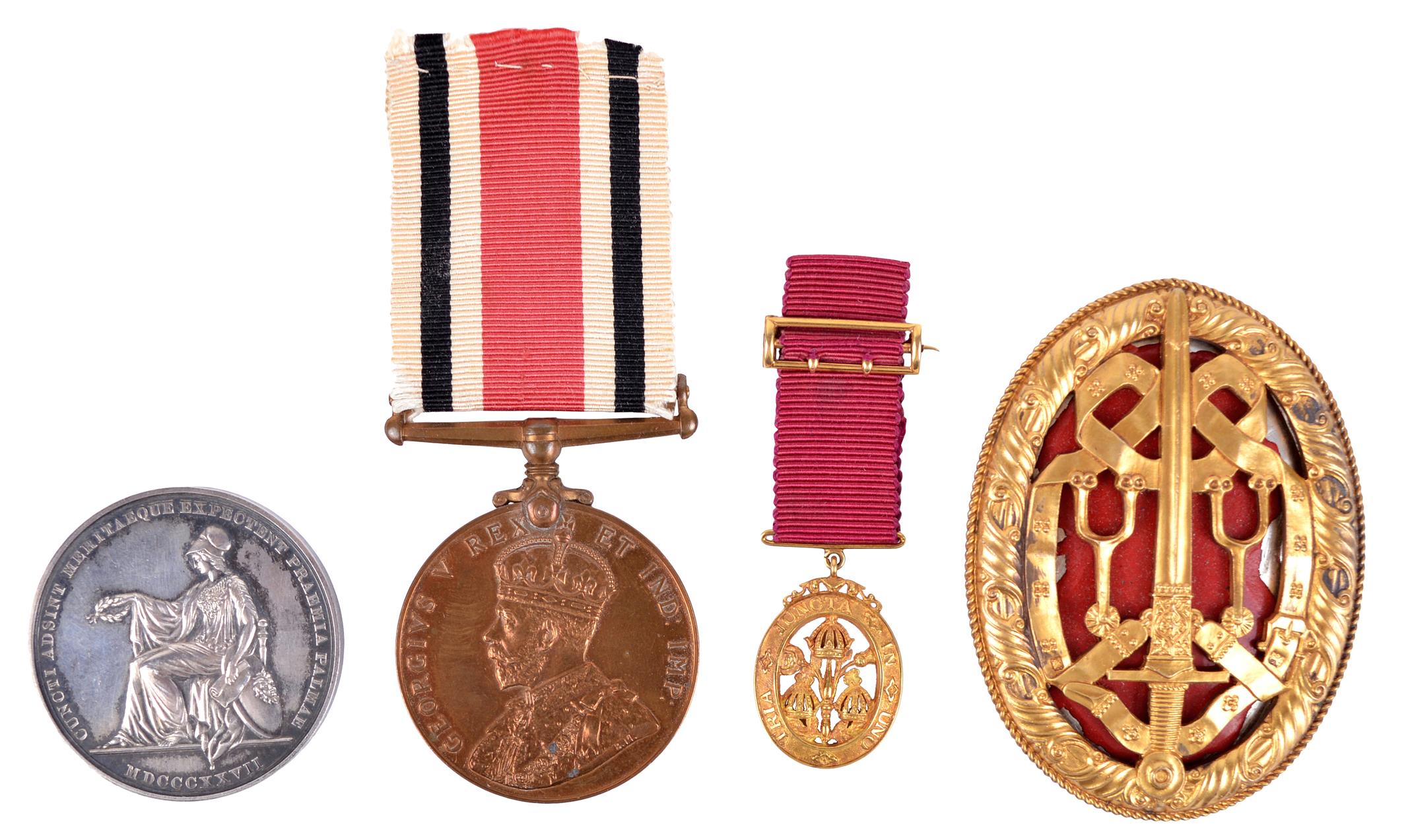 A collection of of insignia and medals, comprising: a Knight Batchelor's badge, silver gilt and enamel, maker's mark 'R.J.', London 1935, damage and loss to enamel, otherwise good very fine or better; the Order of the Bath, miniature badge (civil), with ribbon and buckle brooch, extremely fine; a Special Constabulary Long Service Medal, George V (WILLIAM MARTINEAU), extremely fine; University College London, a silver 3rd prize medal to G. Martineau for Chemistry 1852-3, nearly extremely fine; two 20th Century shooting prizes; a British War Medal 1939-45; and a K.R.R.C. cap badge. [8]