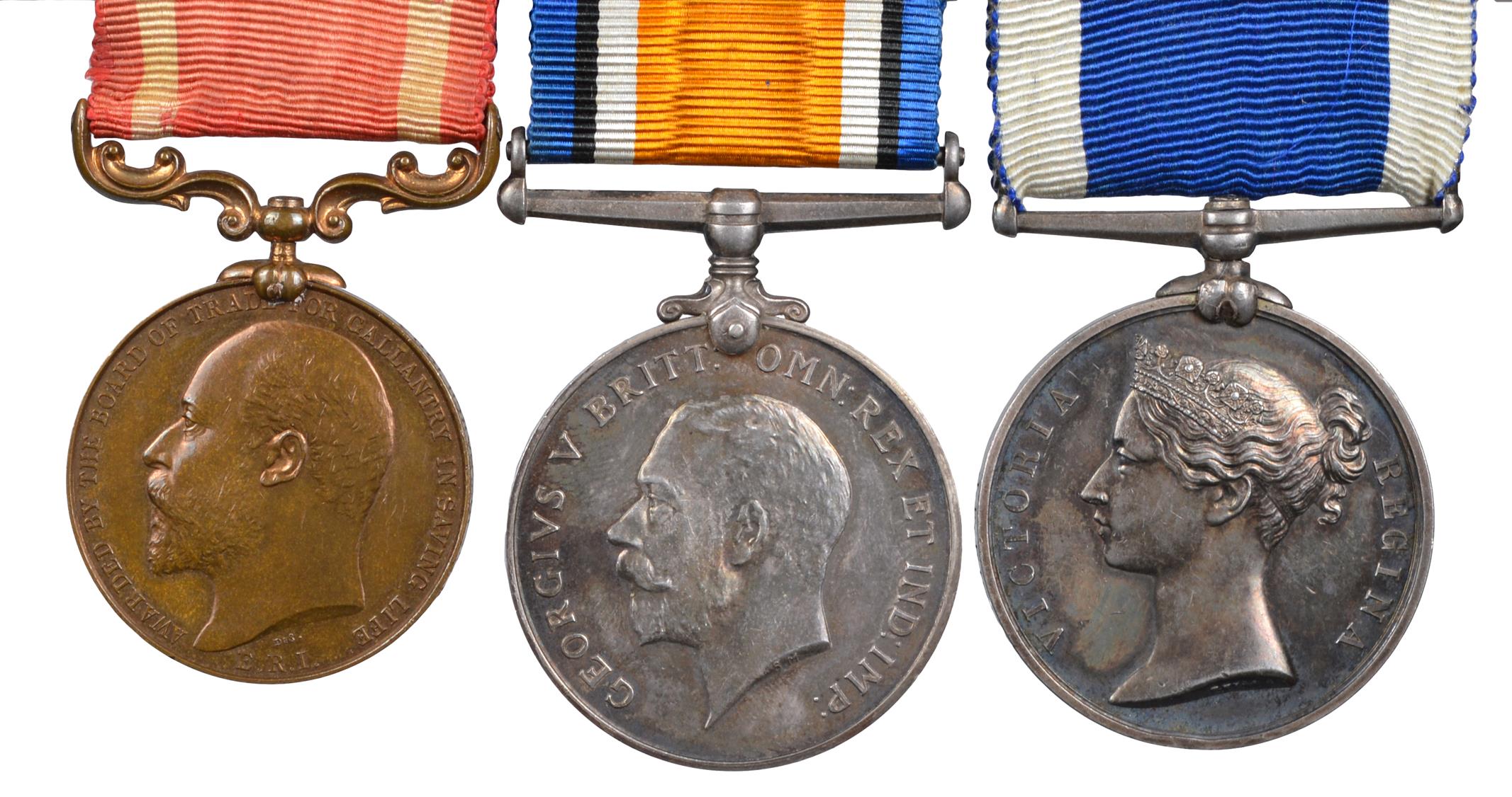 The Sea Gallantry Medal group of three to Chief Boatman (later Honorary Lieutenant R.N.) James Forrester Figgins, H.M. Coastguard, for services during the stranding of the 'Confido': Sea Gallantry Medal, EVIIR, first type small issue in bronze (JAMES F. FIGGINS STRANDING OF THE "CONFIDO" ON THE 16TH MARCH 1903); Naval Long Service and Good Conduct Medal, VR, (J.F. FIGGINS, CHF. BTMN, H.M. COASTGUARD.); British War Medal 1914-20 (LIEUT. J. FIGGINS. R.N.). The first two good very fine, the last about extremely fine.