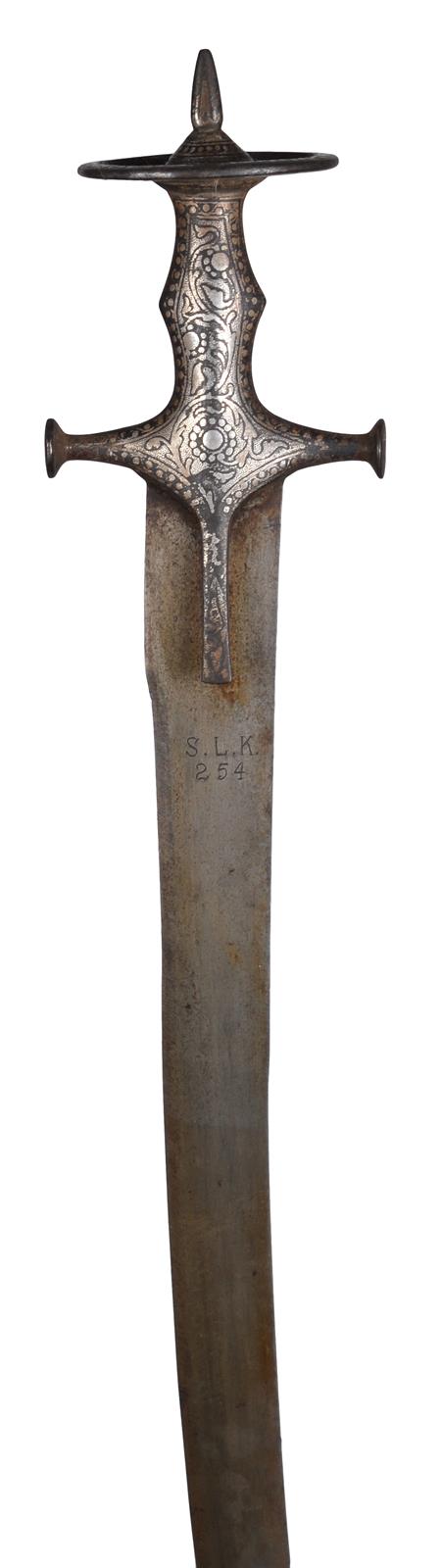 An Indian sword (tulwar), curved blade 33 in., slight straightening of the back towards the point, engraved markings 'S.L.K. 254'; hilt with narrow square ended langets, button terminal quillons, angular grip swell and large disc pommel, the whole decorated with foliage in silver koftgari.