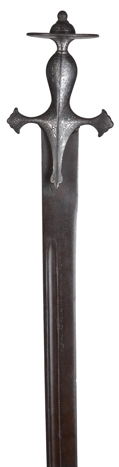 An Indian sword (sosun pata), single edged blade 29 in., with slight forward curve, fullers accentuated by borders of punched dots, etched with a botanical motif to a cartouch; steel hilt with silver koftgari decoration, flaring quillons, disc pommel with dome terminal.