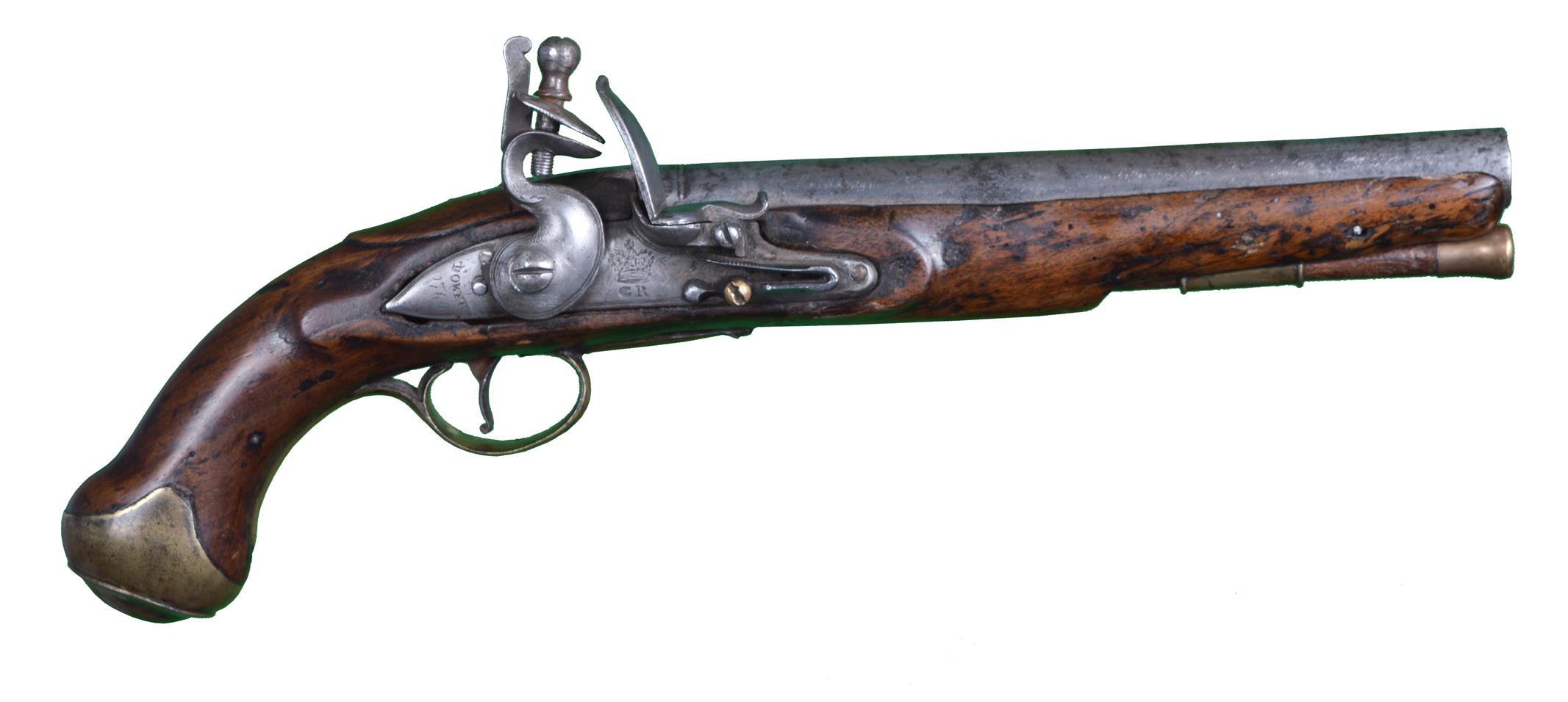 A British 18 bore flintlock pistol, of service type, barrel 9 in. and struck with private Ordnance proof marks; the lock marked 'TOWER 1760' and with crown over 'G.R.'; full stocked with brass furniture, brass tipped wooden ramrod. The date on the lock predates the period in which the Ordnance provided a proof service for private barrels, suggesting that this is a composite weapon.