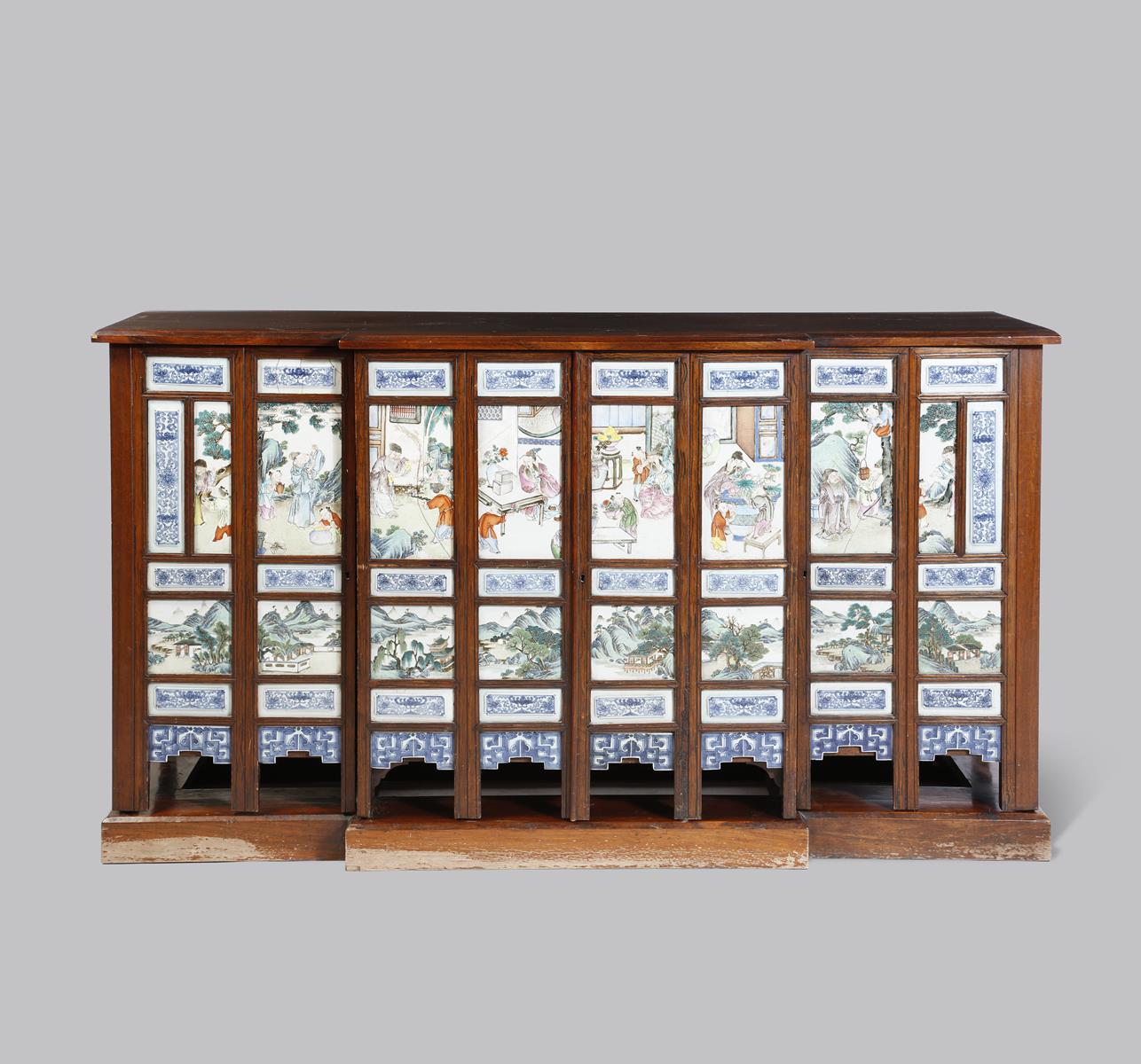 A ROSEWOOD BREAK-FRONT CABINET SET WITH CHINESE PORCELAIN PANELS QING DYNASTY AND LATER With four...