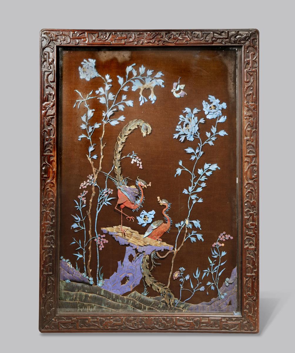 A CHINESE KINGFISHER FEATHER PANEL 18TH/19TH CENTURY Decorated with two phoenix standing on a...