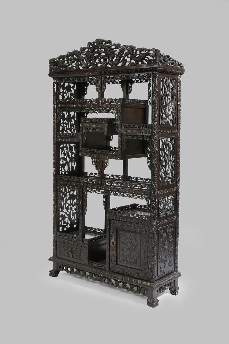 Carved with bamboo, prunus, chrysanthemum and peony and with an arrangement of shelves, a cupboard and a single drawer, the cresting rail decorated with dragons, 186cm x 98cm x 35cm.