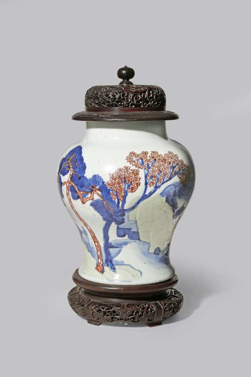 Carved and painted with trees and flying birds and a small figure in a sampan in a rocky landscape, together with a hardwood cover and stand, 24.5cm. (3)