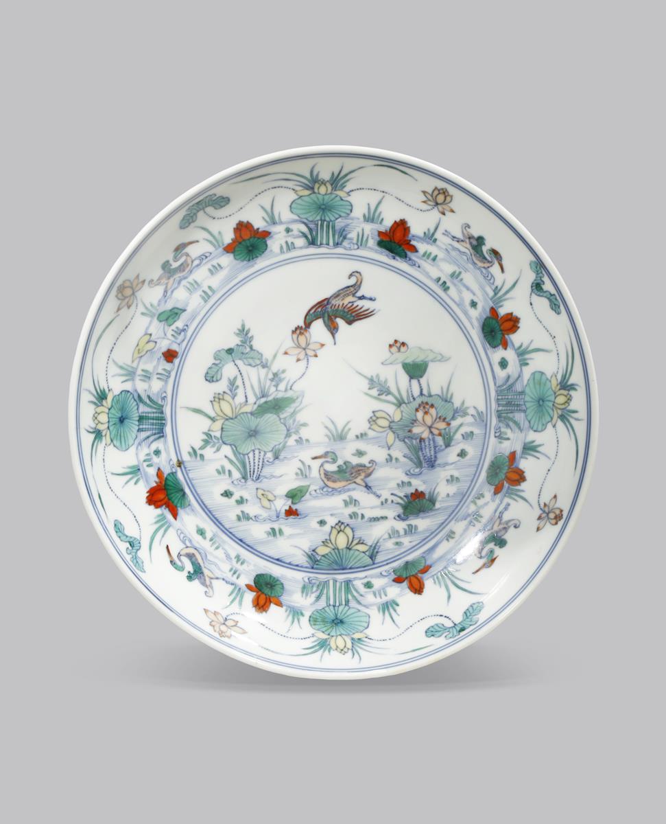 A CHINESE DOUCAI 'MANDARIN DUCKS' DISH YONGZHENG 1723-35 Painted with a lotus pond with five...