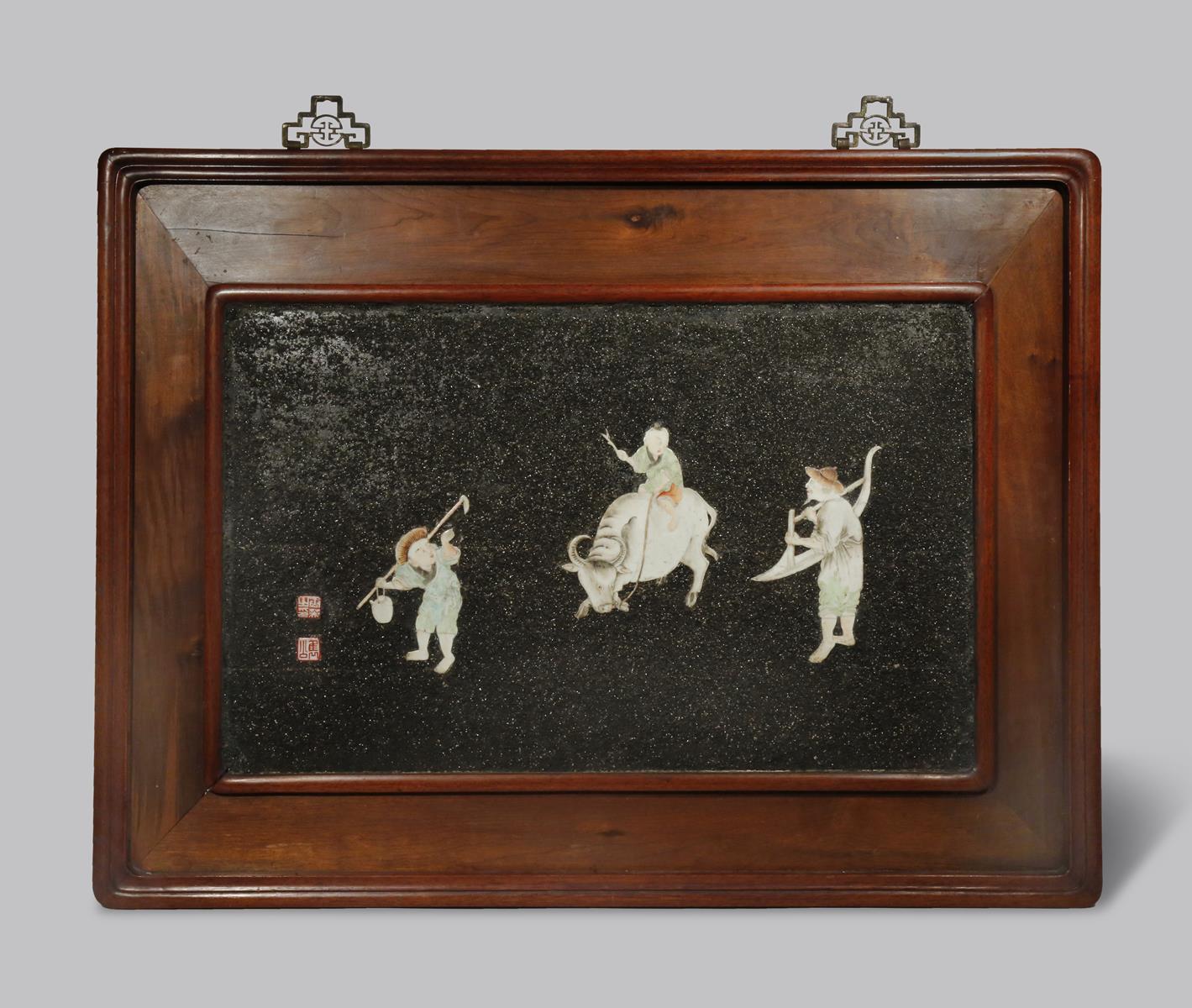 A CHINESE ORNAMENTAL PANEL 18TH/19TH CENTURY Set with three porcelain plaques depicting a boy and...