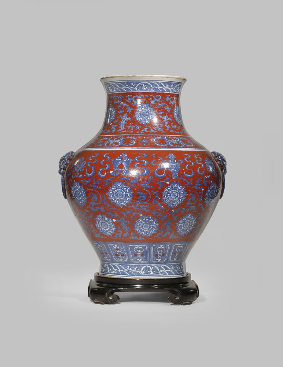 A LARGE CHINESE BLUE AND WHITE AND OVERGLAZED RED HU-SHAPED VASE 19TH CENTURY The body with two...
