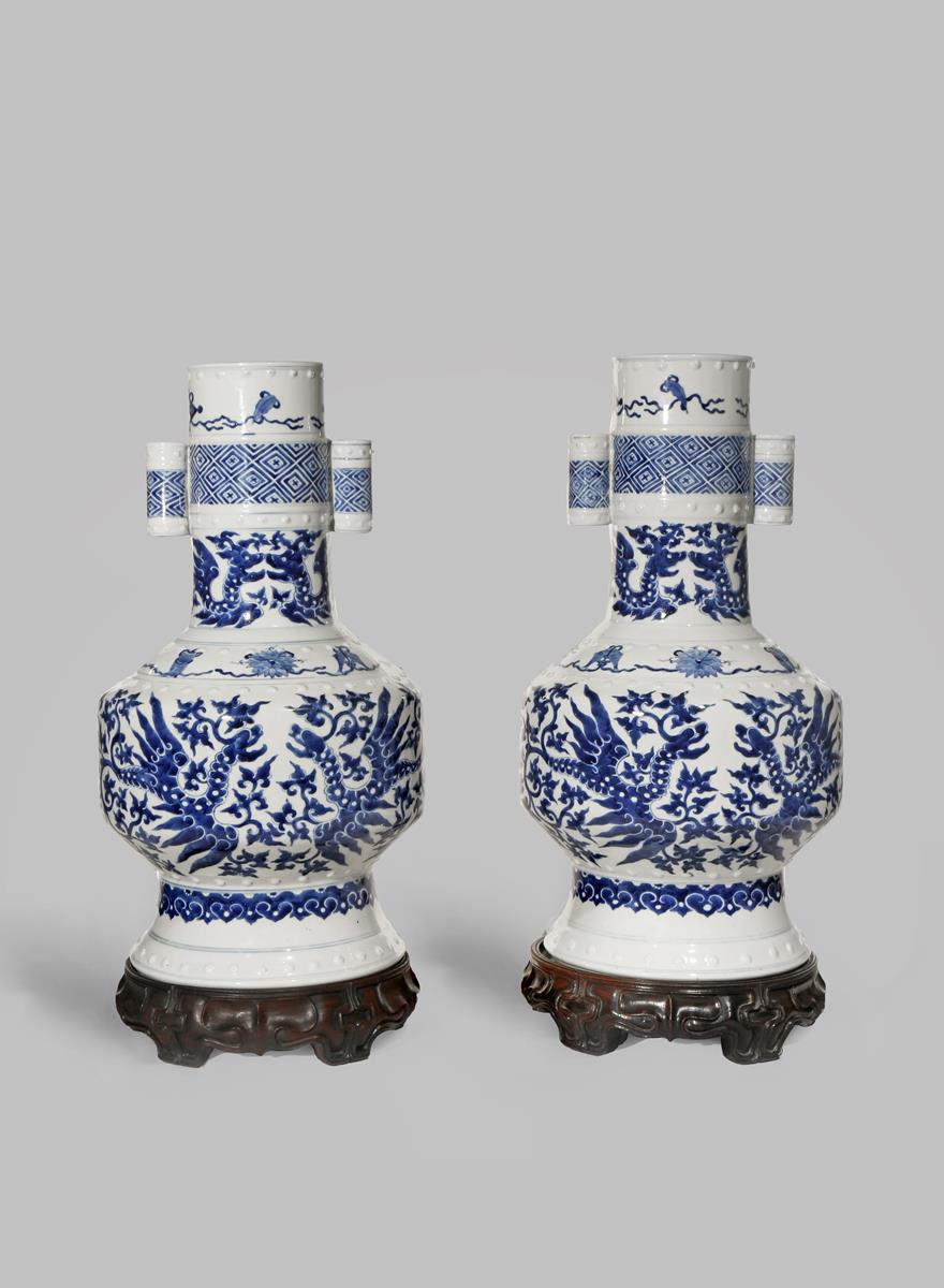 A PAIR OF CHINESE BLUE AND WHITE PHOENIX ARROW VASES 19TH CENTURY The cylindrical bodies painted...