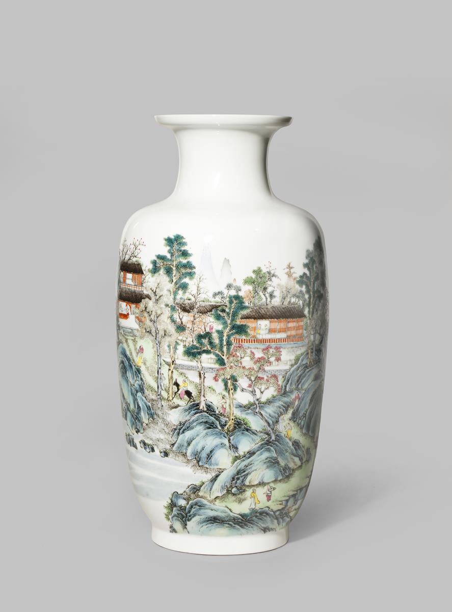A CHINESE FAMILLE ROSE 'LANDSCAPE' VASE REPUBLIC PERIOD Depicting figures in an extensive...