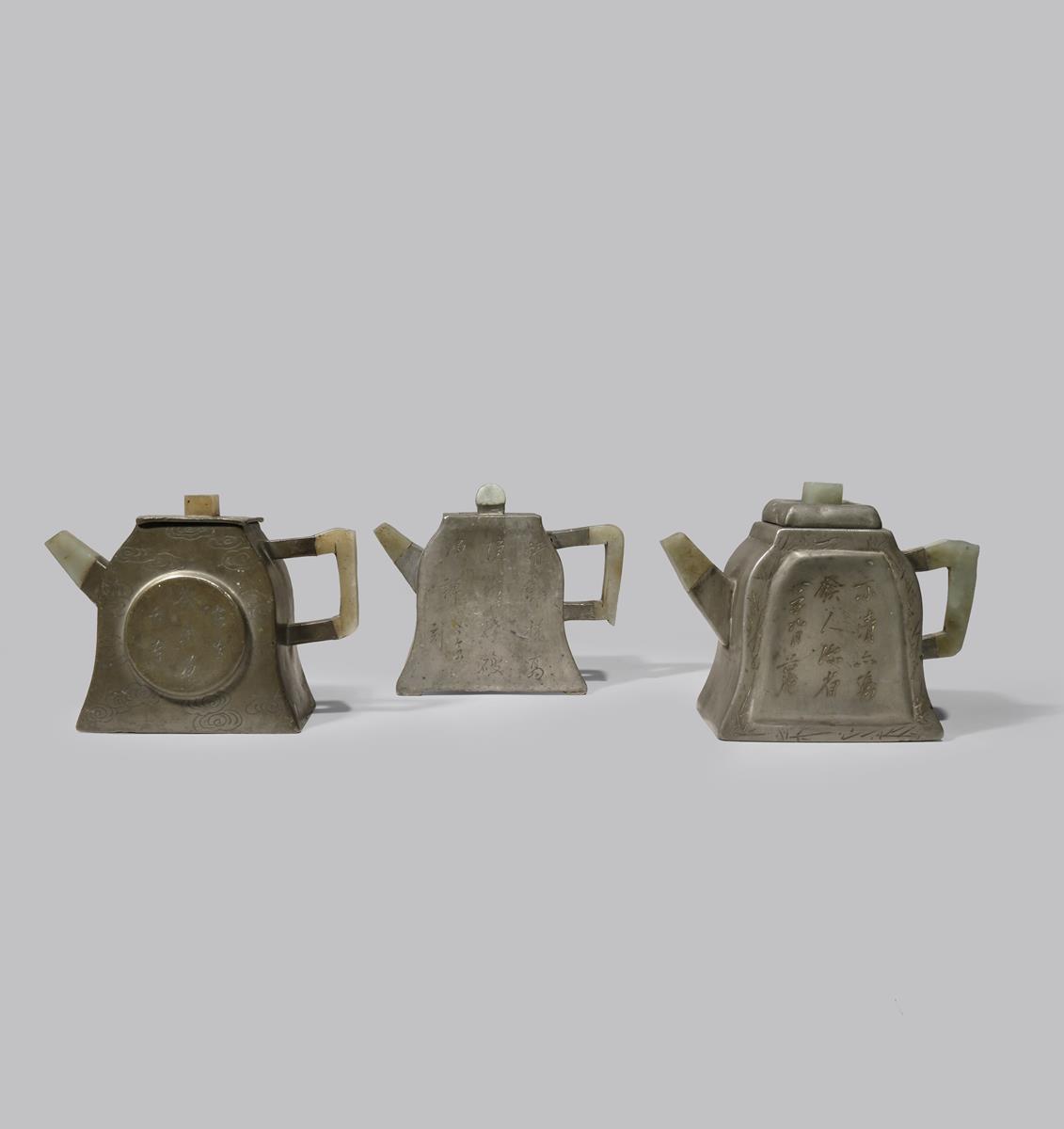 THREE CHINESE INSCRIBED PEWTER-ENCASED YIXING BELL-SHAPED TEAPOTS AND COVERS QING DYNASTY Set...