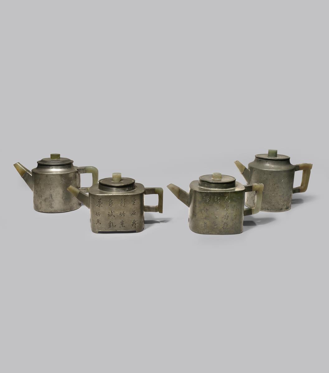 ONE CHINESE PEWTER AND THREE PEWTER-ENCASED YIXING TEAPOTS AND COVERS QING DYNASTY Two of...