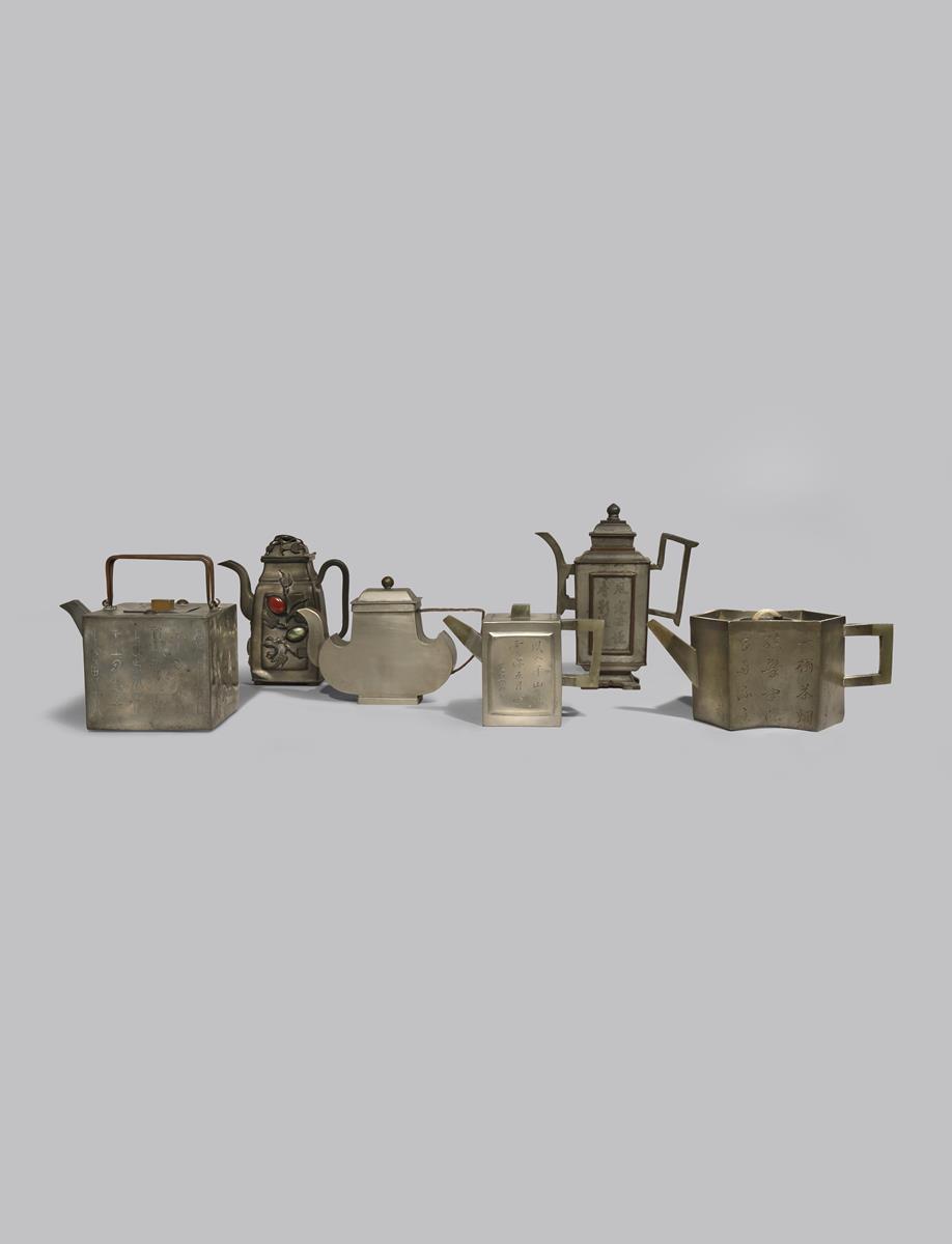 A CHINESE INSCRIBED PEWTER-ENCASED YIXING TEAPOT AND FIVE PEWTER TEAPOTS AND COVERS 20TH CENTURY...