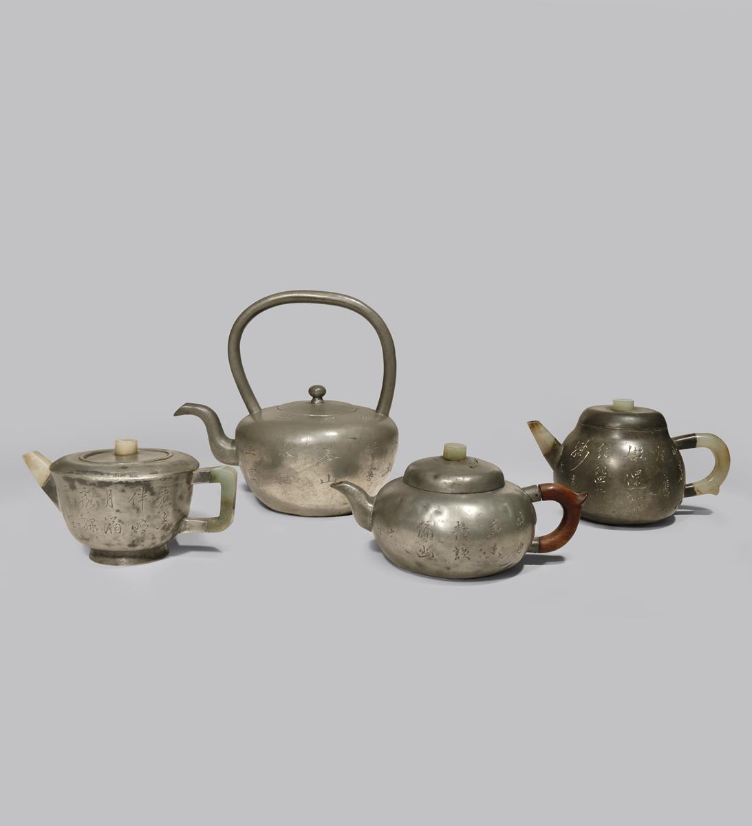 ONE CHINESE PEWTER AND THREE PEWTER-ENCASED YIXING TEAPOTS AND COVERS QING DYNASTY Of circular form