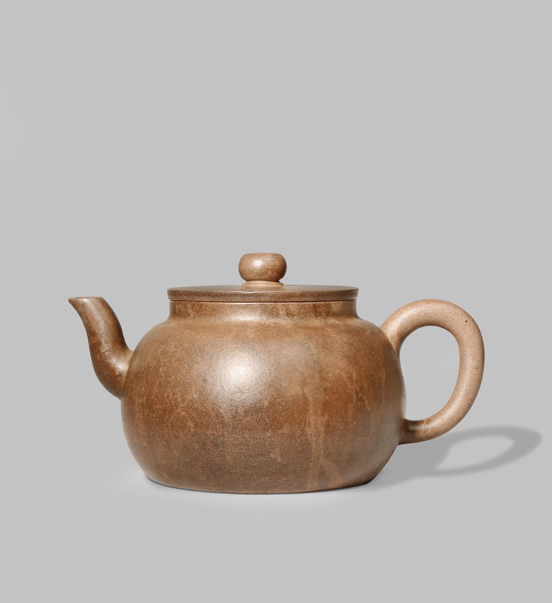 A CHINESE YIXING TEAPOT AND COVER QING DYNASTY With a compressed circular body and simple loop...