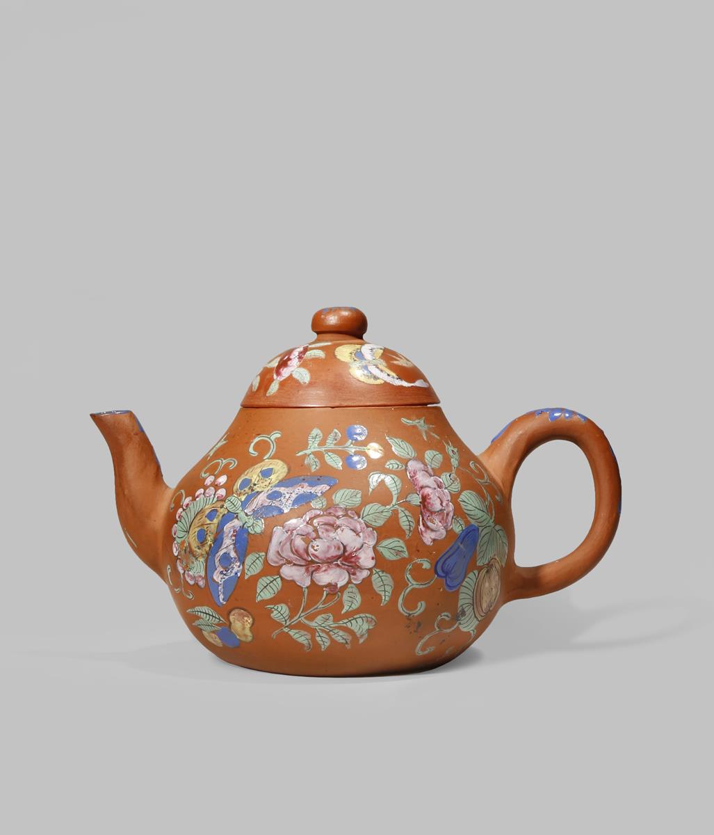 A CHINESE YIXING TEAPOT AND COVER LATE QING DYNASTY The pear-shaped body decorated with colourful...