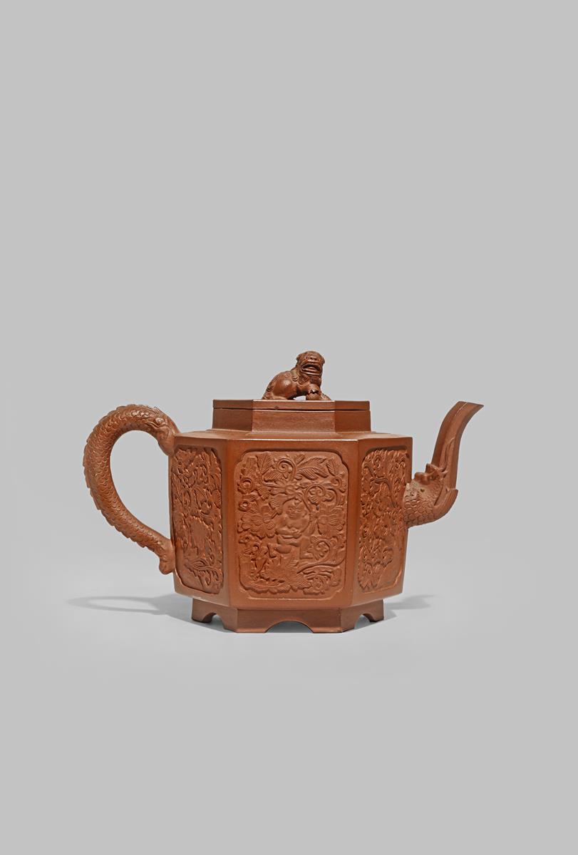 A CHINESE YIXING HEXAGONAL TEAPOT AND COVER 18TH CENTURY The body with two panels moulded with a...