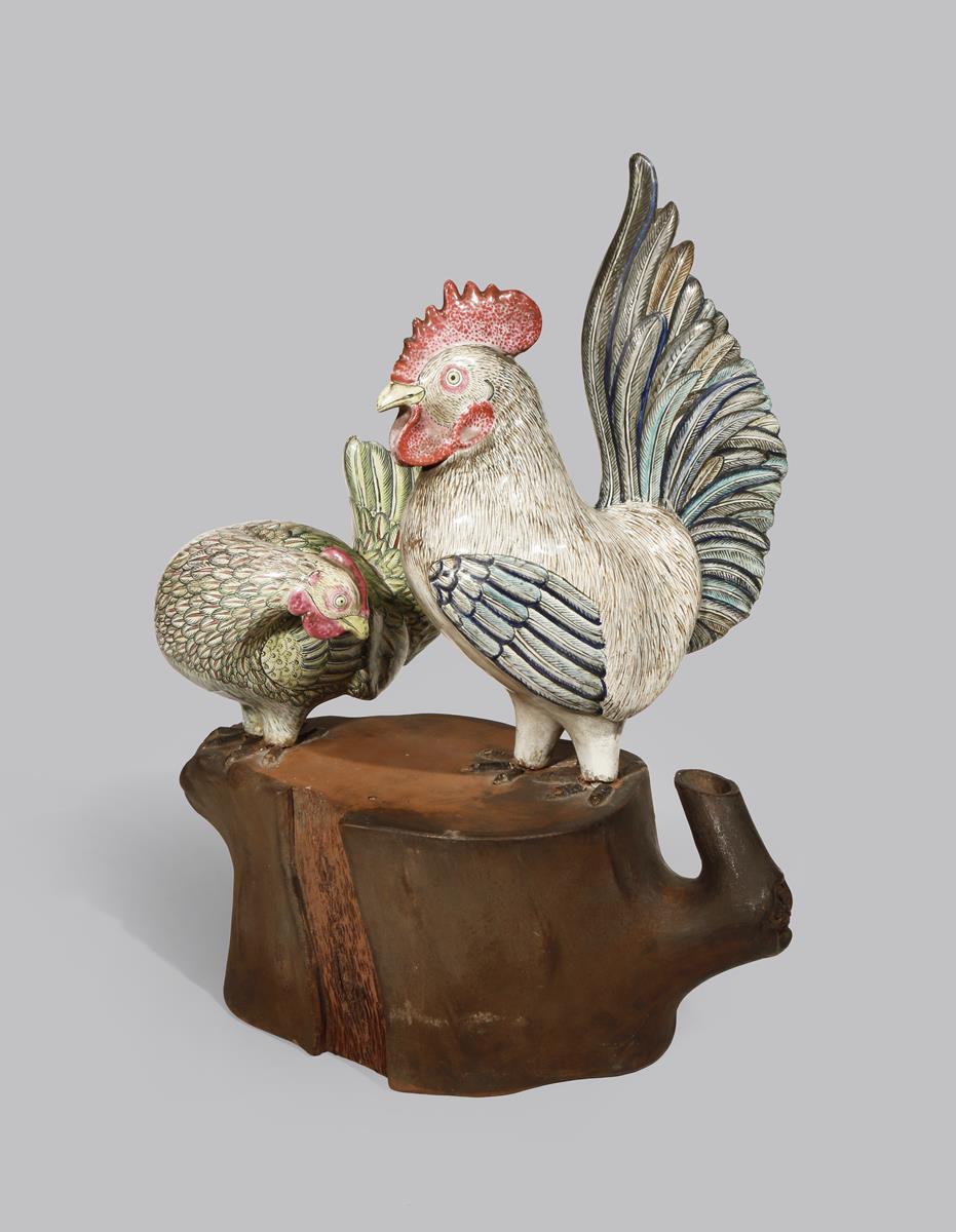 AN UNUSUAL CHINESE ENAMELLED YIXING MODEL OF A COCKEREL AND A HEN 19TH CENTURY Naturalistically...