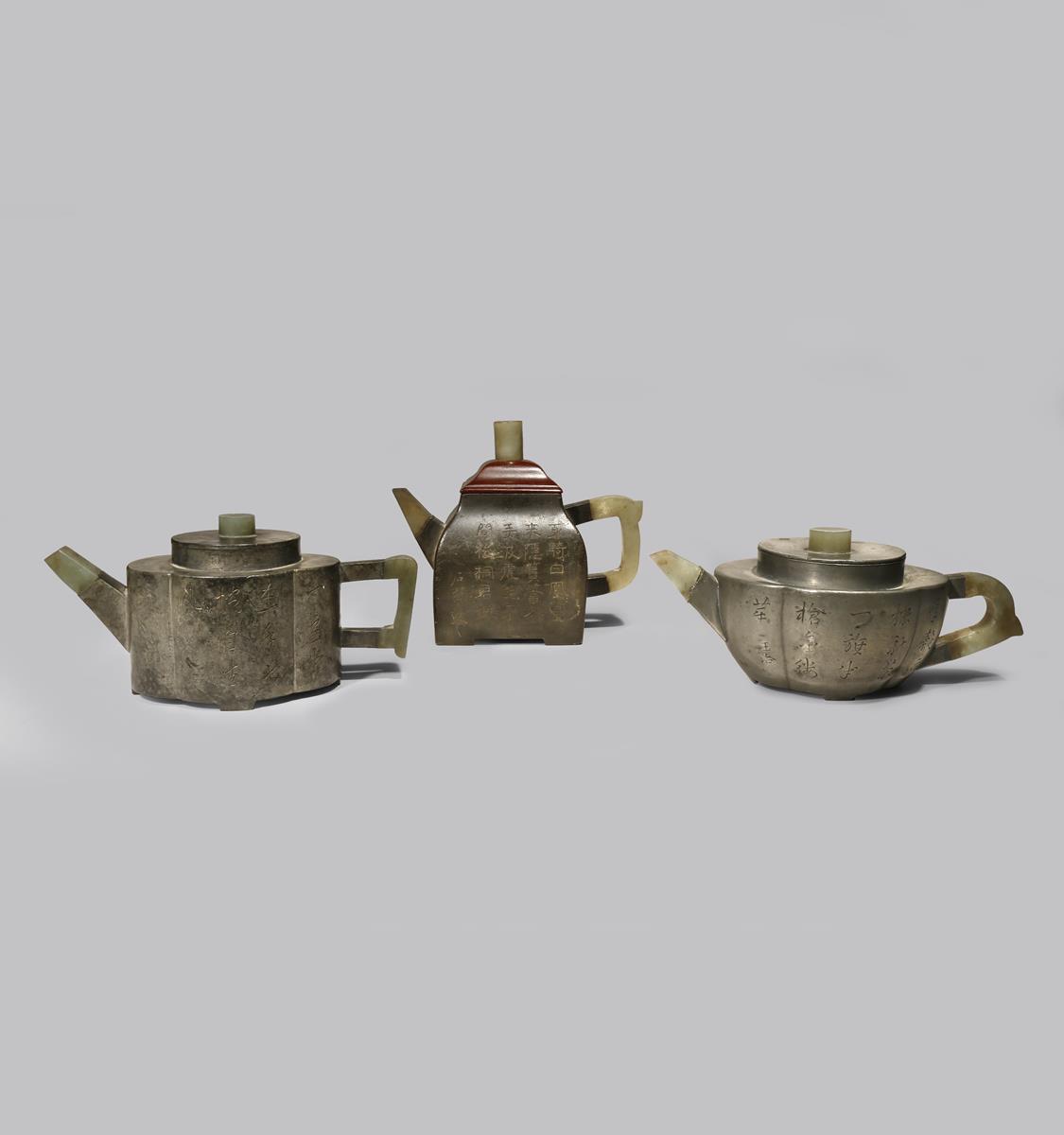 THREE CHINESE INSCRIBED PEWTER-ENCASED YIXING TEAPOTS AND COVERS QING DYNASTY One...