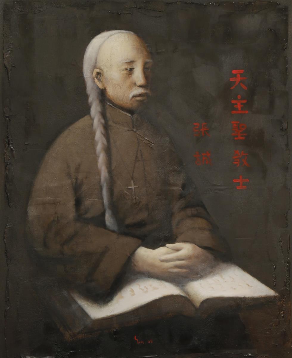 A Chinese painting, oil on canvas, signed Yin, dated 2005, inscribed tian zhu sheng jiao shi chang cheng, Chinese Catholic Jesuit priest Chang Cheng, framed, 98.5cm x 79cm.